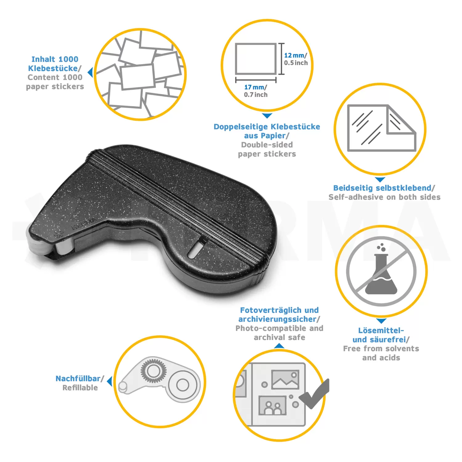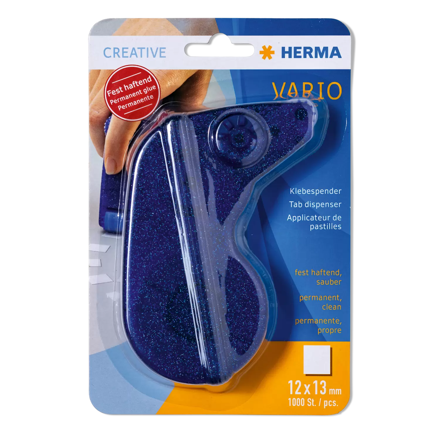 Les distributeurs de ruban adhésif de HERMA Vario, à forte adhérence, sont la solution de collage simple et rapide pour toutes les situations. 1.000 pièces adhésives au format 12 x 13 mm garantissent un collage rapide, propre et précis sur le papier, le carton et de nombreux autres matériaux et sont donc parfaitement adaptés au bureau, à l'école, au bricolage, au collage de photos ou aux travaux créatifs avec du bois, du liège, du film et d'autres matériaux. Les distributeurs de ruban adhésif ergonomiques peuvent être utilisés d'une seule main et sont toujours prêts à l'emploi grâce au rouleau de recharge pratique. Les pièces adhésives sont sans solvants ni acides, tout en étant compatibles avec les photos et résistantes à l'archivage. Elles peuvent être déroulés une par une ou en série, ce qui garantit un maintien sûr.