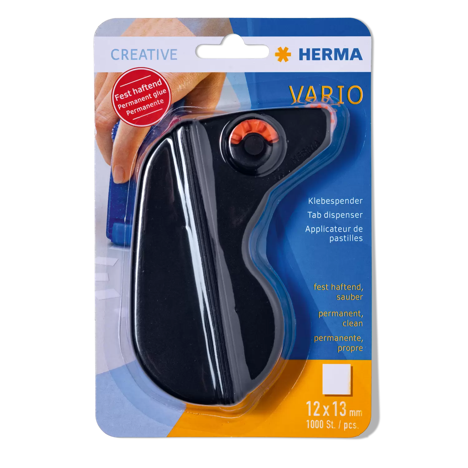 Les distributeurs de ruban adhésif de HERMA Vario, à forte adhérence, sont la solution de collage simple et rapide pour toutes les situations. 1.000 pièces adhésives au format 12 x 13 mm garantissent un collage rapide, propre et précis sur le papier, le carton et de nombreux autres matériaux et sont donc parfaitement adaptés au bureau, à l'école, au bricolage, au collage de photos ou aux travaux créatifs avec du bois, du liège, du film et d'autres matériaux. Les distributeurs de ruban adhésif ergonomiques peuvent être utilisés d'une seule main et sont toujours prêts à l'emploi grâce au rouleau de recharge pratique. Les pièces adhésives sont sans solvants ni acides, tout en étant compatibles avec les photos et résistantes à l'archivage. Elles peuvent être déroulés une par une ou en série, ce qui garantit un maintien sûr.