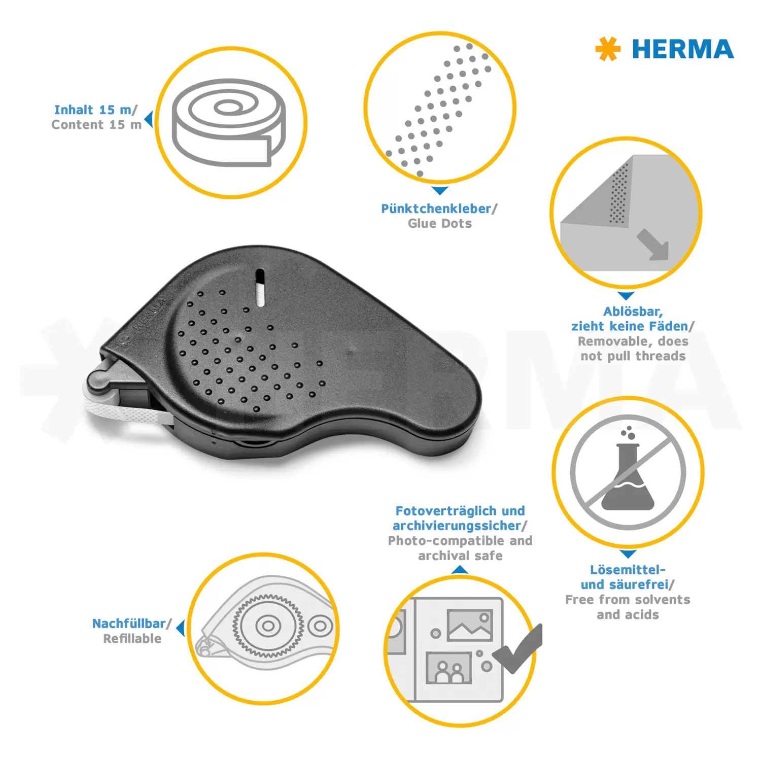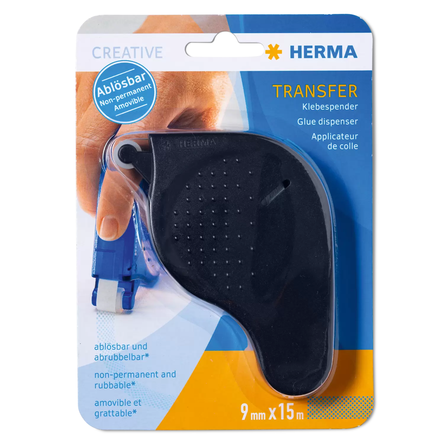 Les distributeurs de ruban adhésif de HERMA Transfer, détachables, sont la solution de collage simple et rapide pour toutes les situations. Ils garantissent un collage rapide, propre et précis sur le papier, le carton et de nombreux autres matériaux et sont donc parfaitement adaptés au bureau, à l'école, au bricolage, au collage de photos ou aux travaux créatifs avec du bois, du liège, du film et d'autres matériaux. Les distributeurs de ruban adhésif ergonomiques peuvent être utilisés d'une seule main et sont toujours prêts à l'emploi grâce au rouleau de recharge pratique. Mal collé ? Pas de problème - la bande adhésive ne durcit pas et permet donc le repositionnement. Les surfaces de préhension sur les côtés assurent une prise optimale, elles tiennent ainsi bien en main et sont très faciles à utiliser - même pour les gauchers. La bande adhésive transparente de 9 mm de large est sans solvants ni acides, tout en étant compatible avec les photos et résistante à l'archivage. En déroulant le rouleau, l’adhésif s’applique par petits points qui garantissent un collage efficace.