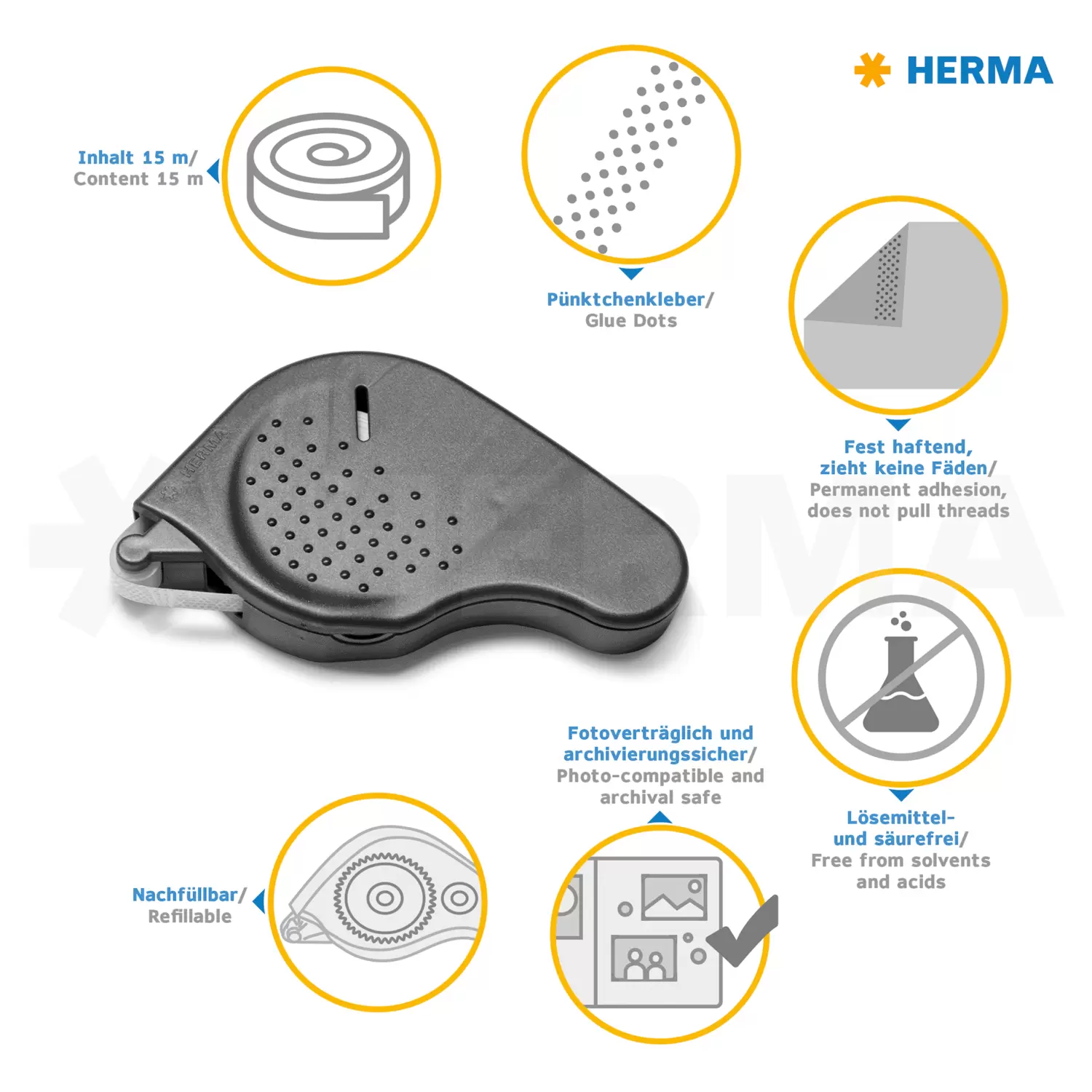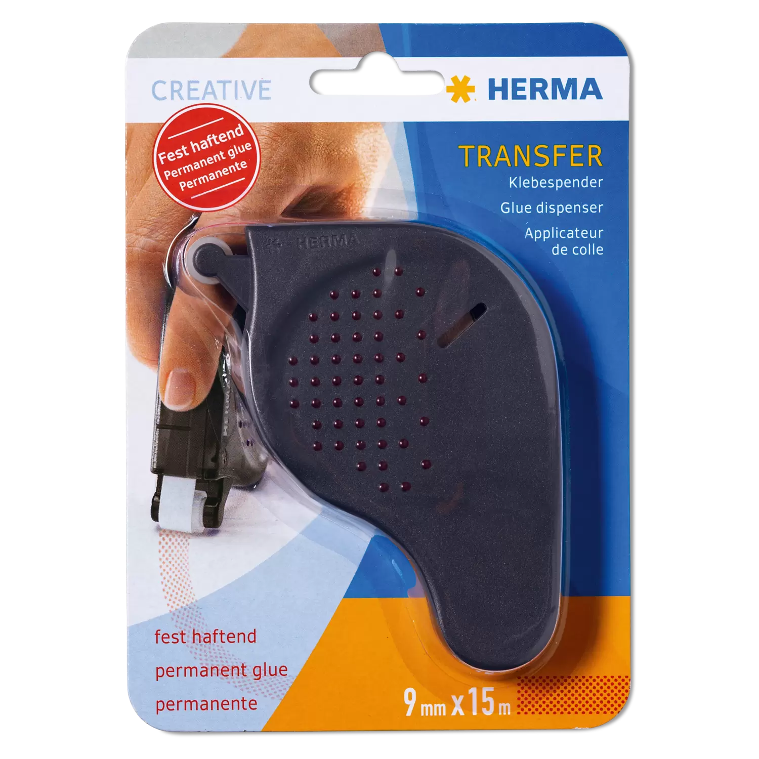 Les distributeurs de ruban adhésif de HERMA Transfer, à forte adhérence, sont la solution de collage simple et rapide pour toutes les situations. Ils garantissent un collage rapide, propre et précis sur le papier, le carton et de nombreux autres matériaux et sont donc parfaitement adaptés au bureau, à l'école, au bricolage, au collage de photos ou aux travaux créatifs avec du bois, du liège, du film et d'autres matériaux. Les distributeurs de ruban adhésif ergonomiques peuvent être utilisés d'une seule main et sont toujours prêts à l'emploi grâce au rouleau de recharge pratique. Les surfaces de préhension sur les côtés assurent une prise optimale, ils tiennent ainsi bien en main et sont très faciles à utiliser - même pour les gauchers. La bande adhésive transparente de 9 mm de large est sans solvants ni acides, tout en étant compatible avec les photos et résistante à l'archivage. En déroulant le rouleau, l’adhésif s’applique par petits points qui garantissent un collage efficace.
