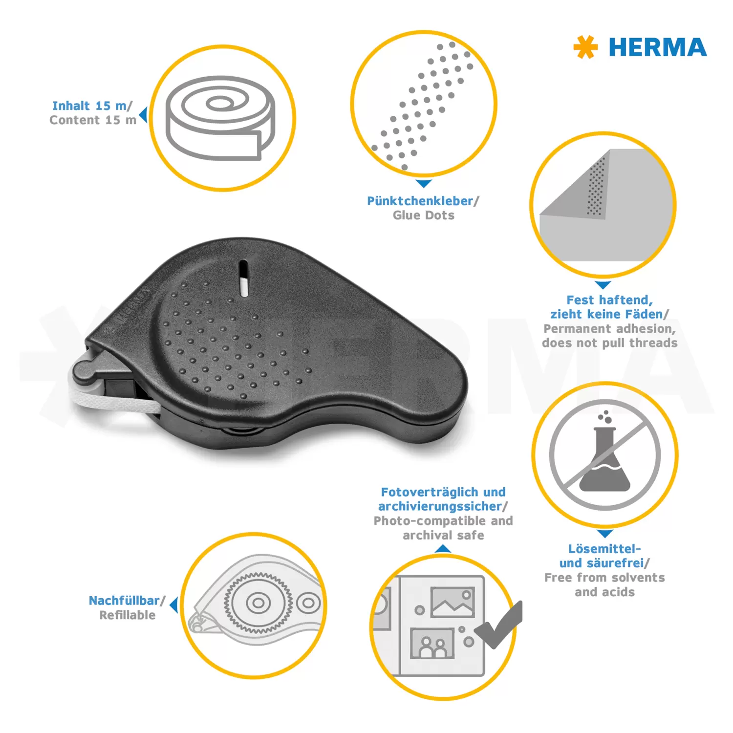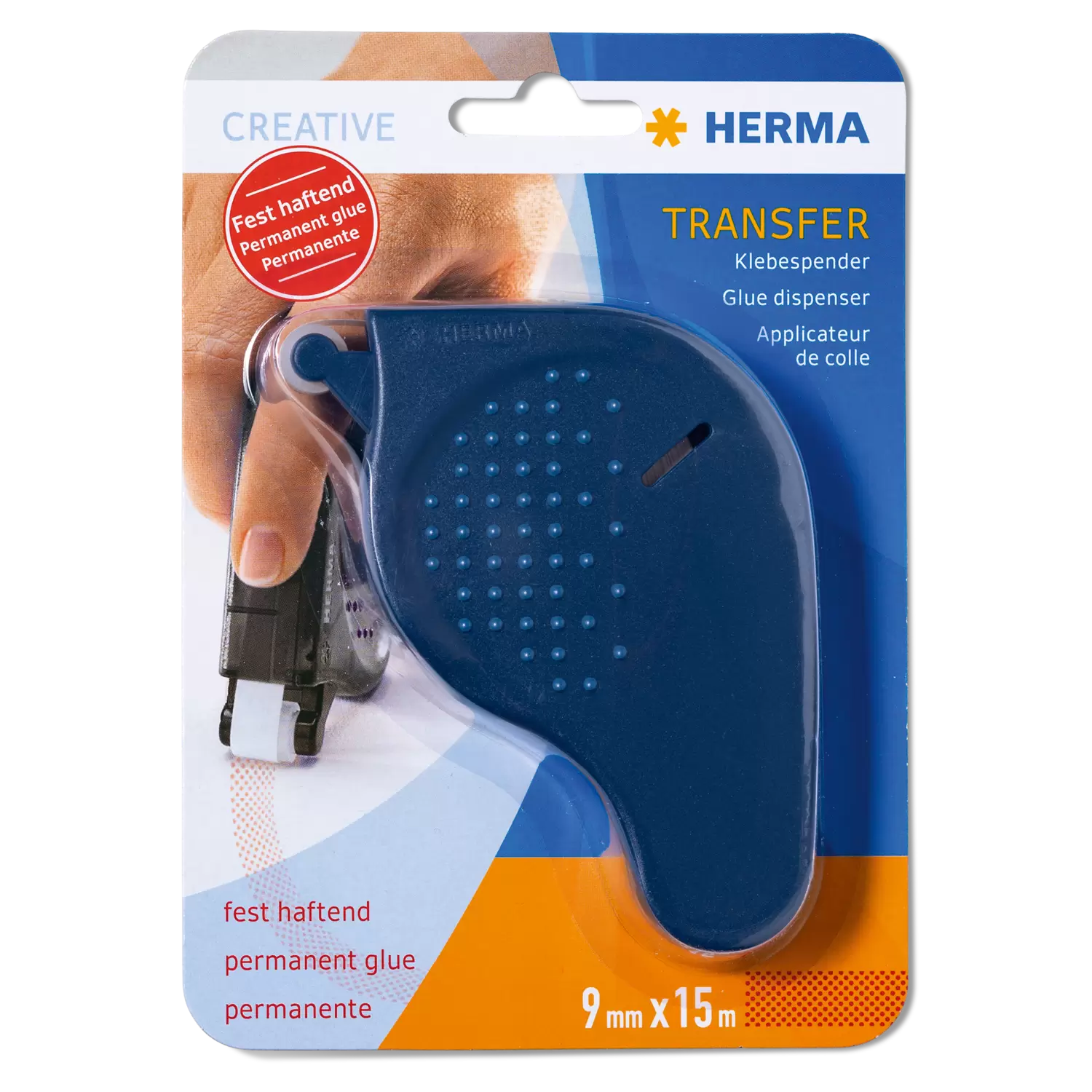 Les distributeurs de ruban adhésif de HERMA Transfer, à forte adhérence, sont la solution de collage simple et rapide pour toutes les situations. Ils garantissent un collage rapide, propre et précis sur le papier, le carton et de nombreux autres matériaux et sont donc parfaitement adaptés au bureau, à l'école, au bricolage, au collage de photos ou aux travaux créatifs avec du bois, du liège, du film et d'autres matériaux. Les distributeurs de ruban adhésif ergonomiques peuvent être utilisés d'une seule main et sont toujours prêts à l'emploi grâce au rouleau de recharge pratique. Les surfaces de préhension sur les côtés assurent une prise optimale, ils tiennent ainsi bien en main et sont très faciles à utiliser - même pour les gauchers. La bande adhésive transparente de 9 mm de large est sans solvants ni acides, tout en étant compatible avec les photos et résistante à l'archivage. En déroulant le rouleau, l’adhésif s’applique par petits points qui garantissent un collage efficace.