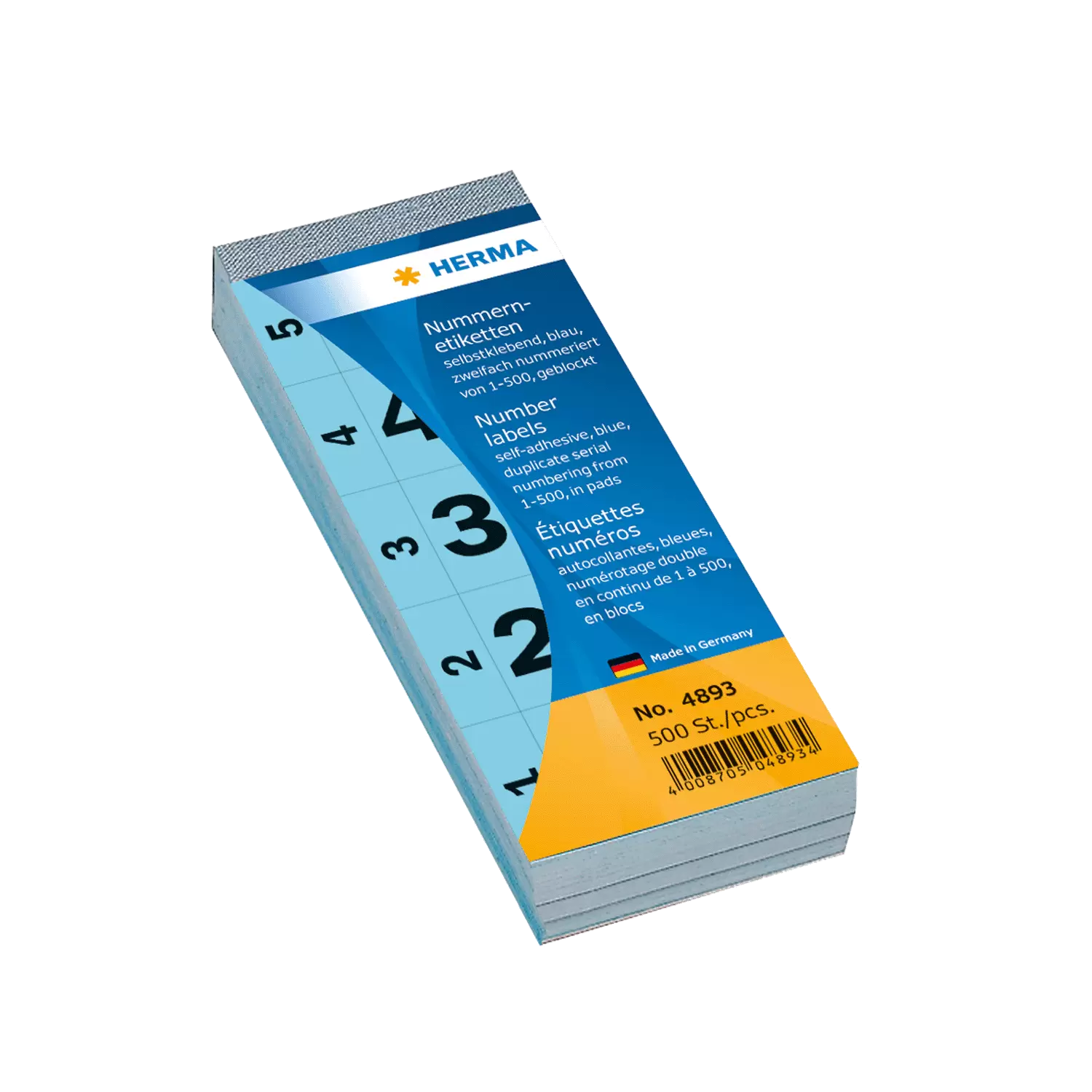 Blocs de numéros autocollants, en papier. Format d'étiquette 28 x 56 mm, partagée en deux. Impression de deux numéros identiques en noir. Numérotation continu de 1 à 500, avec 5 numéros doubles par feuille. Blocs de 100 feuilles = 500 numéros doubles.