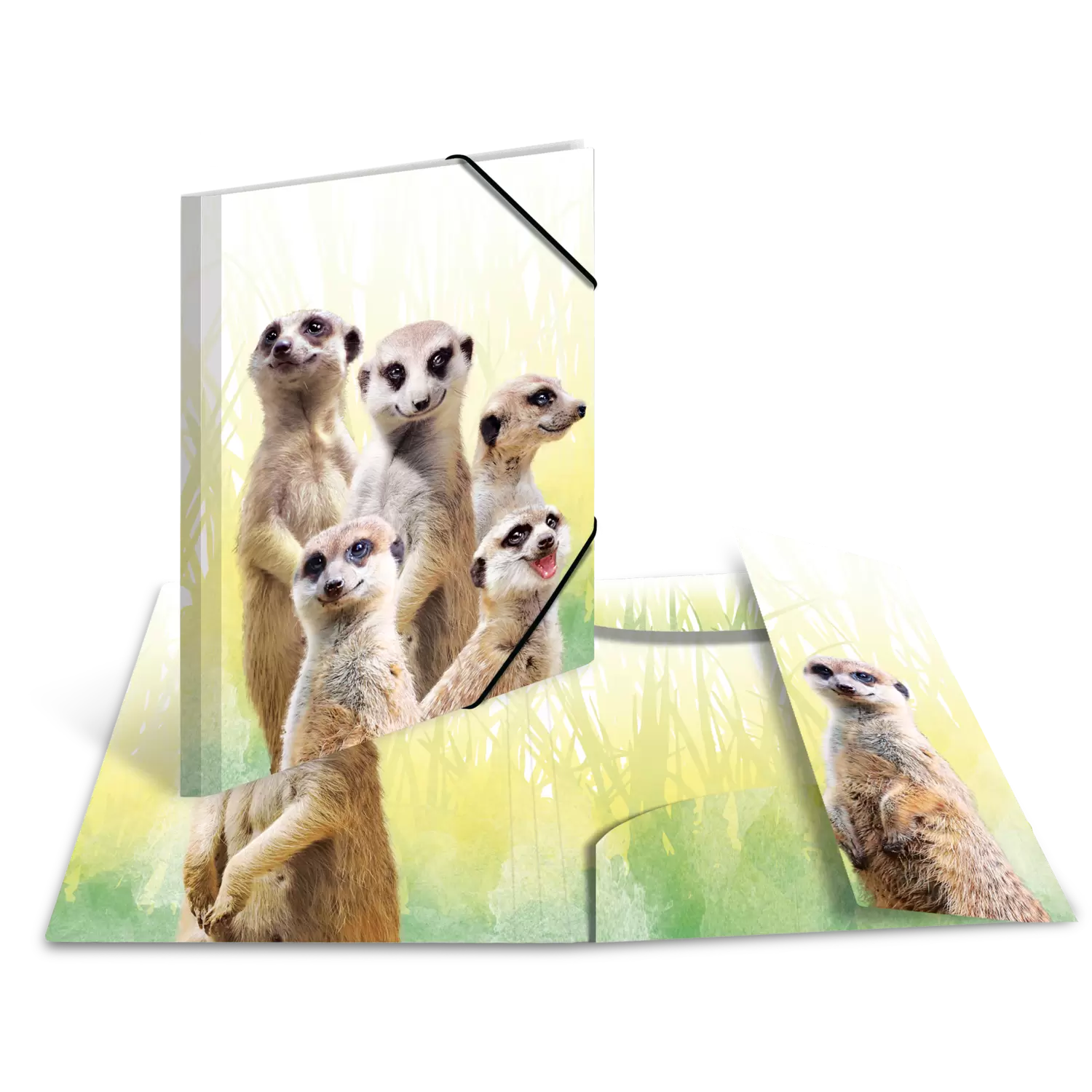 La chemise de classement avec motif animal bande tropicale de HERMA, avec intérieur imprimé en couleurs convient parfaitement pour tous les amis des animaux qui souhaitent réunir l'ordre et l'aspect visuel. La chemise de classement dispose d'un fond simple au motif de fourrure. Elle nous regarde attentivement, cette bande de suricates, ces travailleurs en équipe avec une division parfaite du travail. La chemise de classement et les 4 autres motifs animaux font partie de la série du monde des animaux exotiques qui répand la bonne humeur et qui propose tout ce dont les écolières et les écoliers, les étudiantes et les étudiants ont besoin pour un rangement facile et rapide des documents et des œuvres d'art importants. Elle dispose de fixations d'angle de qualité qui évitent que le contenu ne tombe ou soit perdu. Les papiers bénéficient aussi d'une protection optimale contre la saleté, les salissures et autres facteurs extérieurs car la chemise de classement de HERMA dispose de trois rabats intérieurs intégrés. Elle est en outre très robuste et lavable. Fabriquée en polypropylène solide la chemise vous aident à mettre de l'ordre et à vous donner un aperçu de vos différents documents. D'autres motifs de la série sont les amis des girafes, la famille de koalas, la bande tropicale et la bande de singes. Elle est conçue au format 440 mm x 335 mm pour un rangement optimal d'images et de dessins jusqu'au format DIN A3. La particularité de ces chemises sont les pages intérieures imprimées avec motif adapté à la partie extérieure. Pour des chefs d'œuvre plus petits, des lettres, des notes et des dossiers un assortiment avec les mêmes motifs est également disponible en format DIN A4.