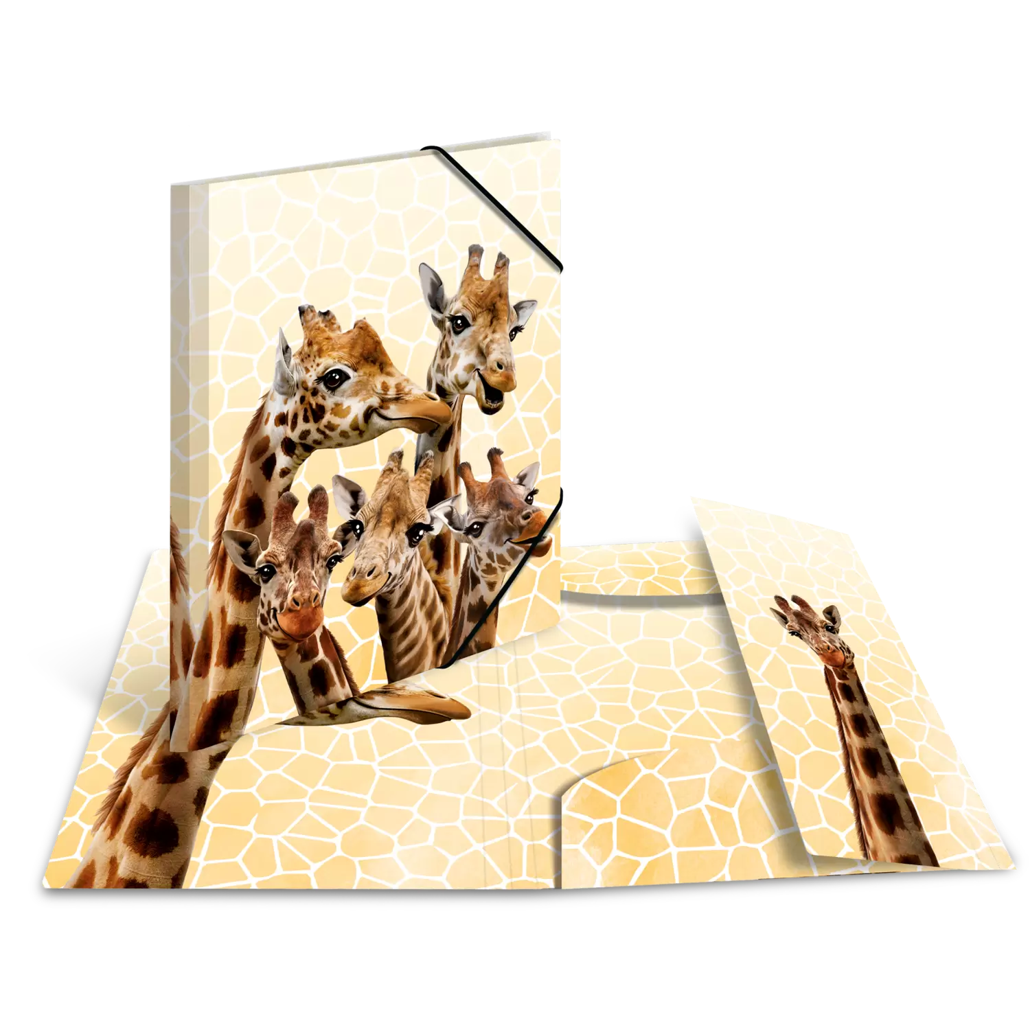 La chemise de classement avec motif animal amis des girafes de HERMA, avec intérieur imprimé en couleurs convient parfaitement pour tous les amis des animaux qui souhaitent réunir l'ordre et l'aspect visuel. La chemise de classement dispose d'un fond simple au motif de fourrure pour que les girafes avec leurs beaux yeux et longs cils attirent l'œil et captent toute l'attention. La chemise de classement et les 4 autres motifs animaux font partie de la série du monde des animaux exotiques qui répand la bonne humeur et qui propose tout ce dont les écolières et les écoliers, les étudiantes et les étudiants ont besoin pour un rangement facile et rapide des documents et des œuvres d'art importants. Elle dispose de fixations d'angle de qualité qui évitent que le contenu ne tombe ou soit perdu. Les papiers bénéficient aussi d'une protection optimale contre la saleté, les salissures et autres facteurs extérieurs car la chemise de classement de HERMA dispose de trois rabats intérieurs intégrés. Elle est en outre très robuste et lavable. Fabriquée en polypropylène solide la chemise vous aide à mettre de l'ordre et à vous donner un aperçu de vos différents documents. Grâce à sa taille compacte la chemise de classement peut être transportée facilement du bureau ou de l'école à la maison - parfait pour le sac à dos, le cartable ou le porte-documents. D'autres motifs de la série sont la famille de koalas, la bande tropicale, la bande de singes et la bande de suricates. Elle est conçue au format 320 mm x 240 mm pour un rangement optimal d'images et de dessins jusqu'au format DIN A4. La particularité de ces chemises sont les pages intérieures imprimées avec motif adapté à la partie extérieure. Pour des chefs d'œuvre plus grands et des dossiers est également disponible un assortiment avec les mêmes motifs en format DIN A3.
