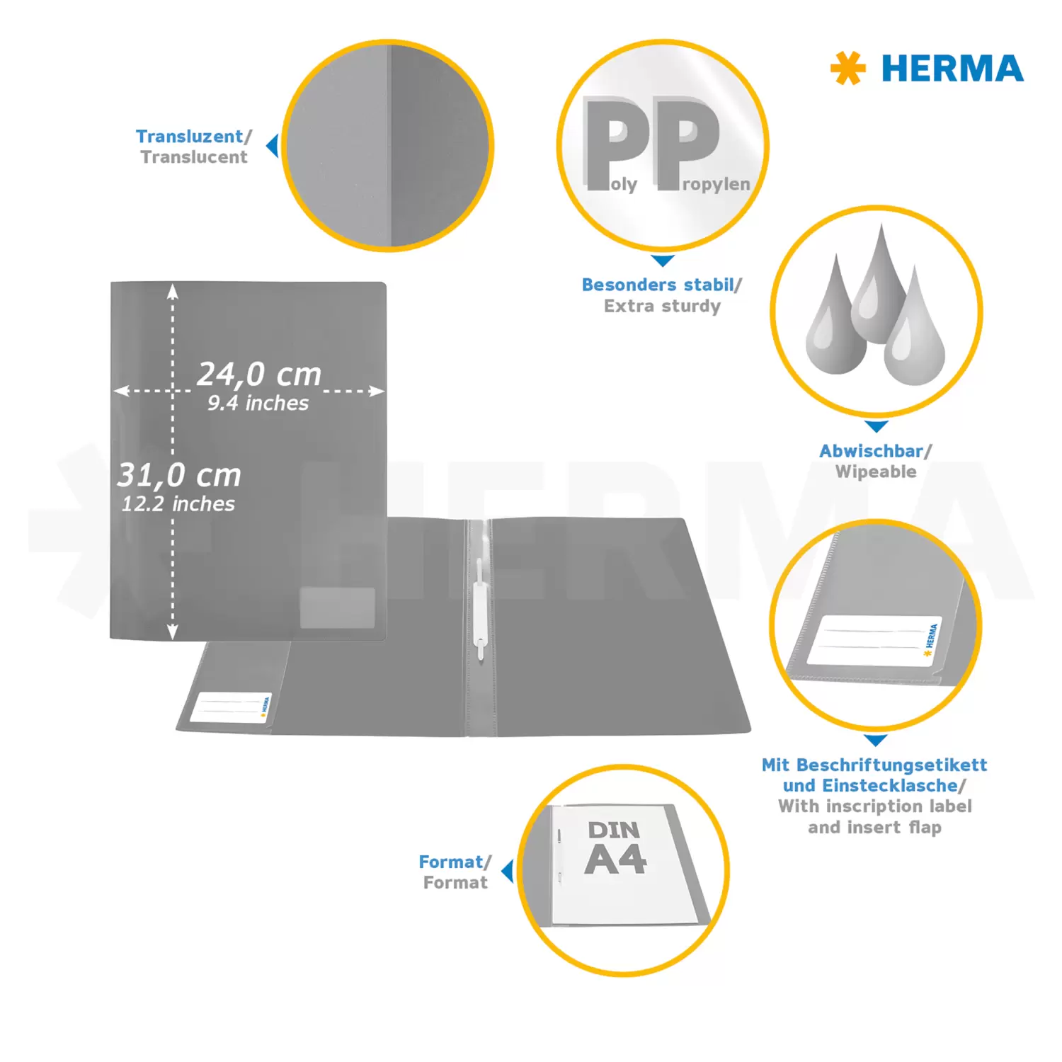 - Classeur à lamelle pour A4 en film propylène écologique, fortement translucide avec languette métallique, dans 14 coloris, avec étiquette de marquage et pochette