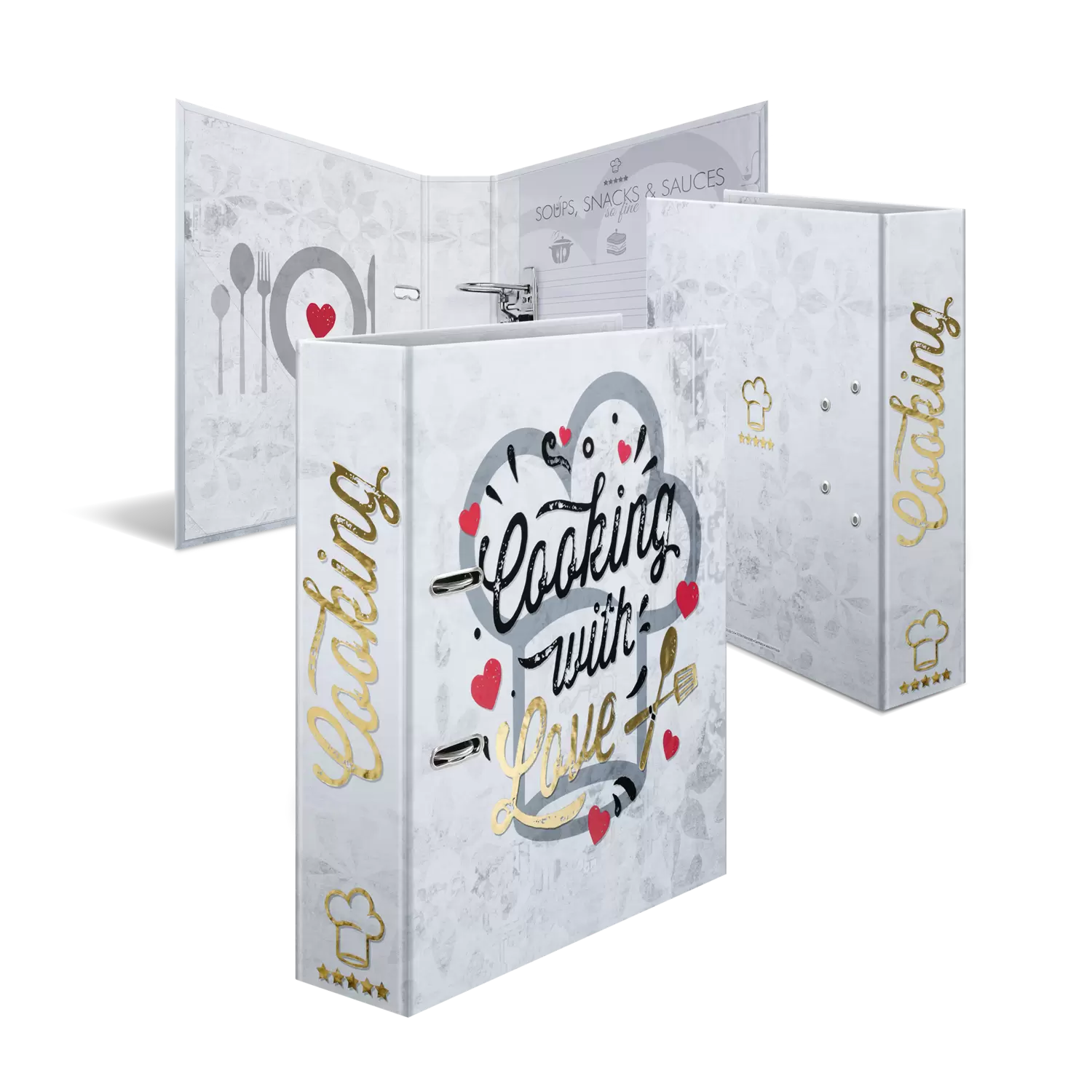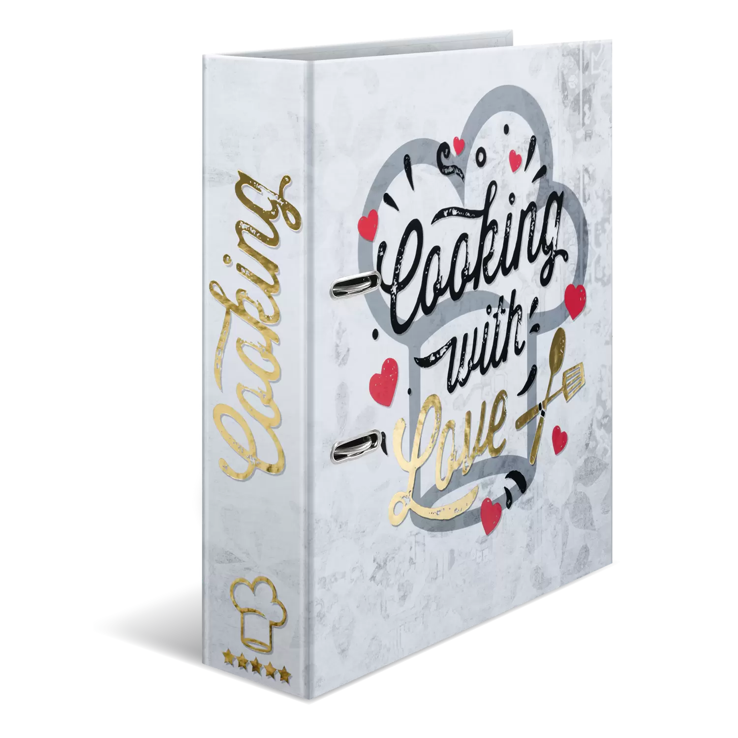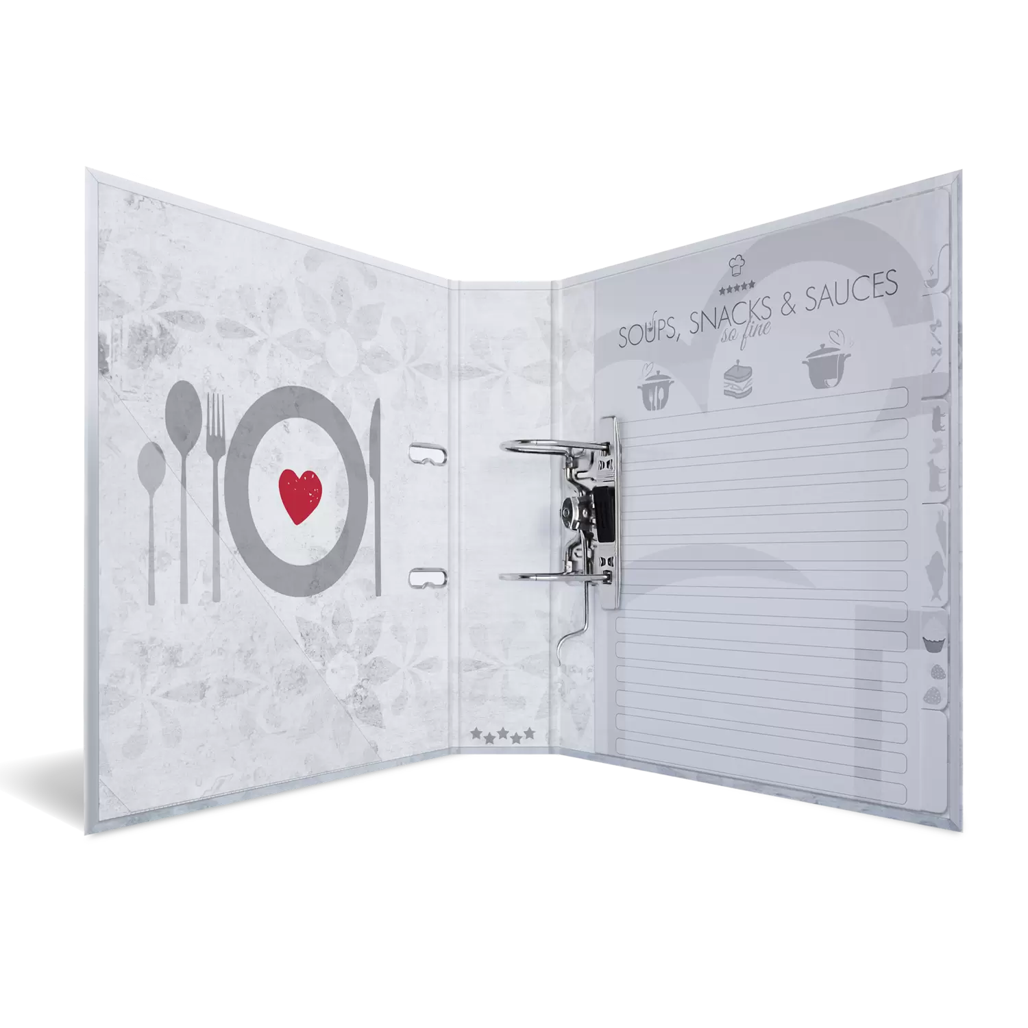 Le classeur à motifs « Cooking with Love » de HERMA au format A4 offre beaucoup de place pour les recettes préférées de pâtisserie et de cuisine et convient à toutes les pochettes transparentes avec perforation standard. Les recettes restent ainsi bien protégées des éclaboussures et des traces de doigt. Grâce à 6 intercalaires, les recettes, les idées, les conseils et les astuces sont faciles à classer et à retrouver. Les intercalaires sont divisés en « Soups, Snacks & Sauces », « Pasta <(>&<)> Co. »,« Meat », « Veggies <(>&<)> Seafood », « Dessert » et disposent d'une page vide à personnaliser. Idéal pour tous ceux qui aiment cuisiner, qui veulent essayer de nouvelles choses en cuisine ou simplement expérimenter. Le classeur décoratif au design clair est fabriqué en carton solide, possède un mécanisme à levier de grande qualité avec dispositif de retenue et est embelli d'une feuille d'or - un accroche-regard sur l'étagère de la cuisine. Astuce : la pochette collée à l'intérieur pour les notes importantes et autres.