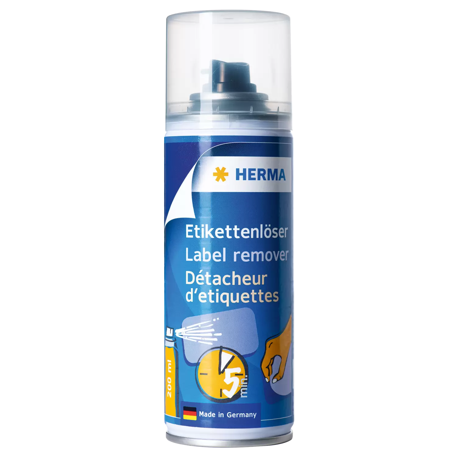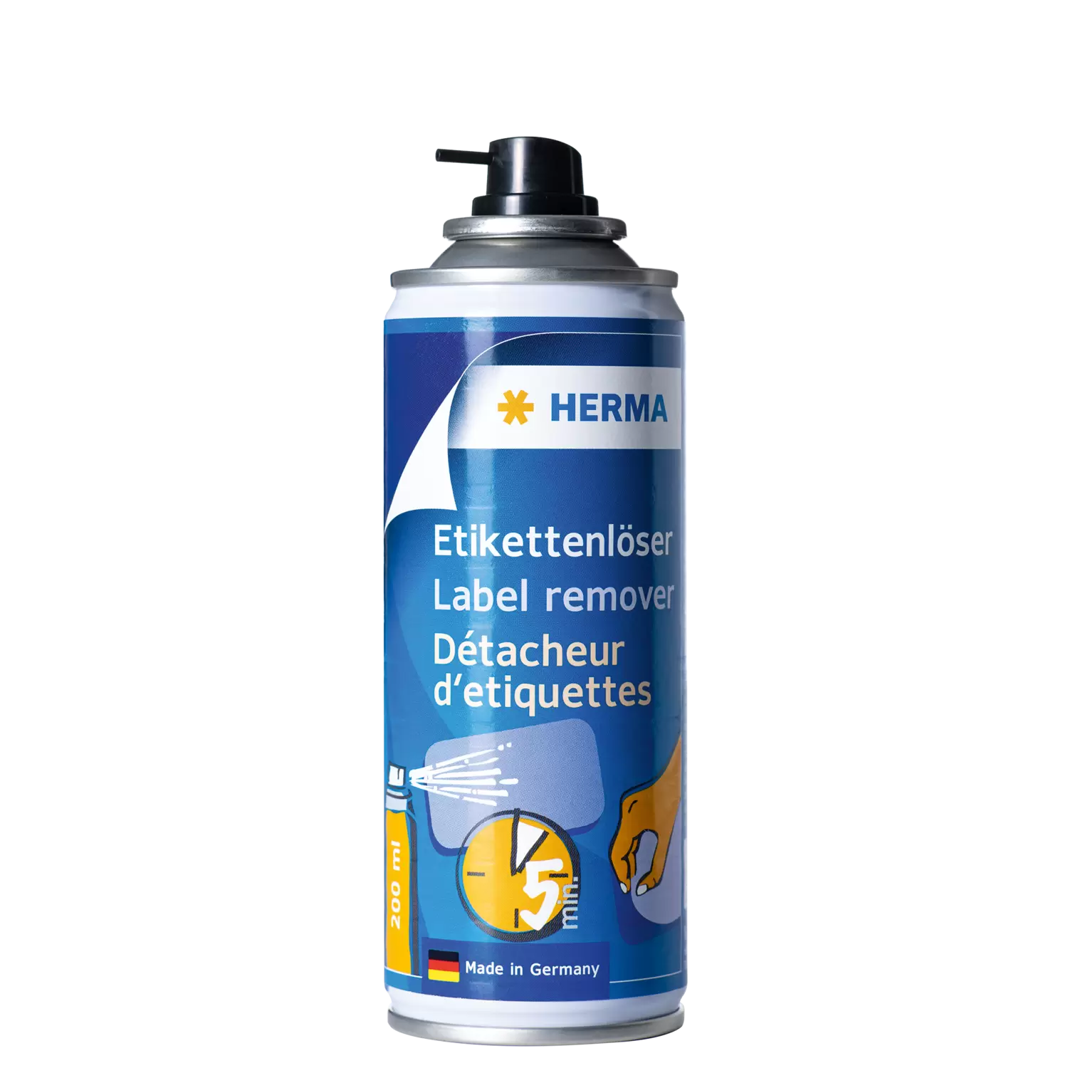 Le dissolvant d'étiquettes de HERMA Spray Aerosol enlève rapidement et facilement les étiquettes en papier autocollantes non enduites, par exemple sur les articles ménagers, la vaisselle ou les casseroles, mais aussi sur de nombreuses autres surfaces et objets comme les chaussures ou les appareils techniques. Grâce à l'aérosol pratique, ce spray est particulièrement adapté aux grandes étiquettes ou aux grandes surfaces. Pour l'utiliser, il suffit d'enlever le capuchon, de l'appliquer sur l'étiquette en papier à l'aide de la pointe de pulvérisation fine et de bien l'humidifier. Après quelques minutes seulement, l'étiquette peut être enlevée facilement. Essuyer les éventuels restes de colle ou l'humidité résiduelle du solvant avec un essuite-tout propre. Le dissolvant pour étiquettes est fabriqué en Allemagne à base de plantes. Il peut être utilisé sans problème sur toutes les surfaces non sensibles comme le verre, le plastique ou le métal. Attention aux surfaces et matériaux sensibles et enduits : tester à un endroit peu visible avant l'utilisation.
