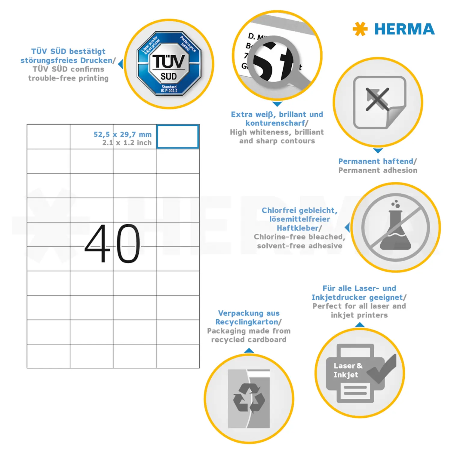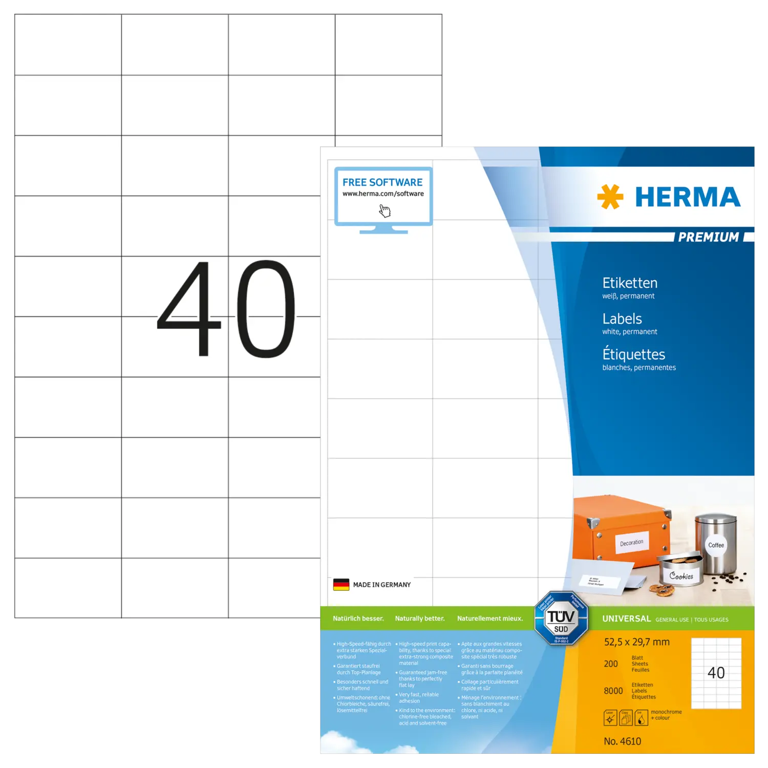 Étiquettes PREMIUM, A4, 52,5 x 29,7 mm, blanches, adhérence permanente