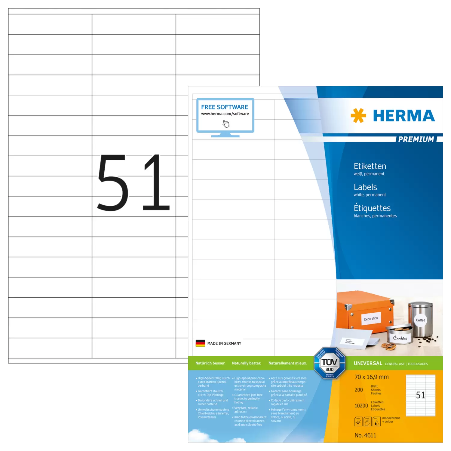 Étiquettes PREMIUM, A4, 70 x 16,9 mm, blanches, adhérence permanente