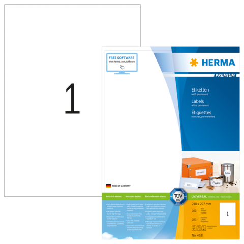 Étiquettes PREMIUM, A4, 210 x 297 mm, blanches, adhérence permanente
