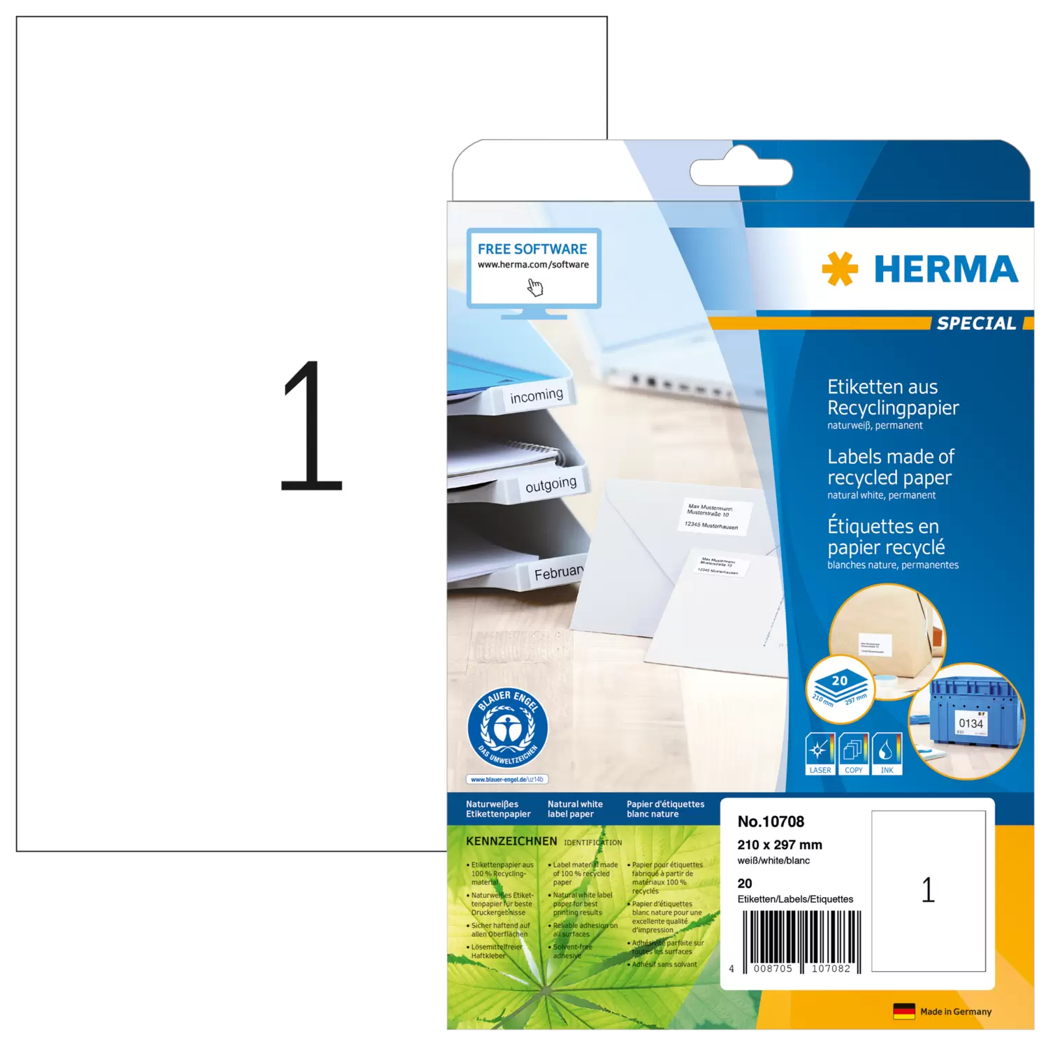 Étiquettes en papier recyclable, A4, 210 x 297 mm, blanches, adhérence permanente