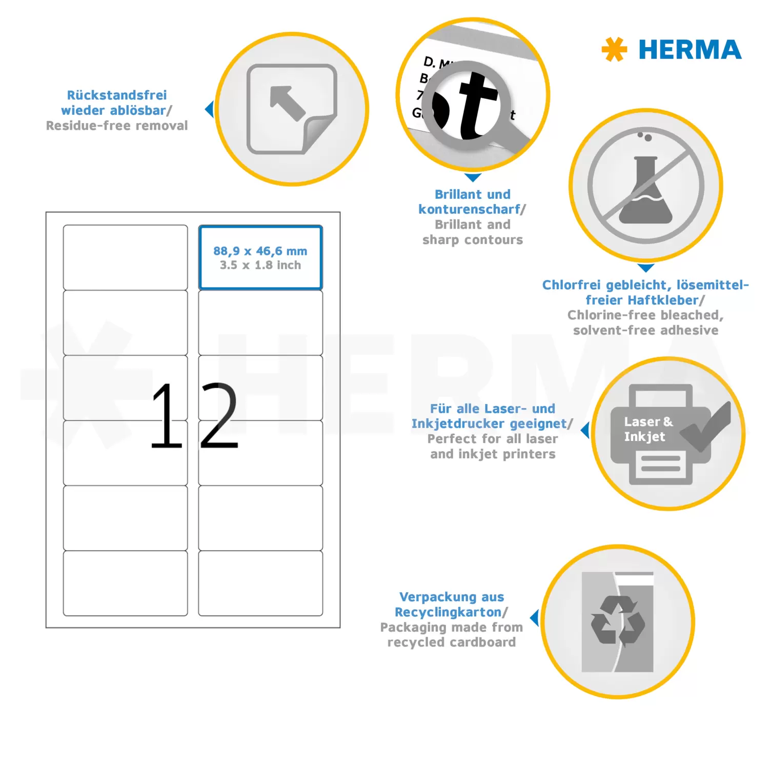 Étiquettes amovibles, A4, 88,9 x 46,6 mm, blanches