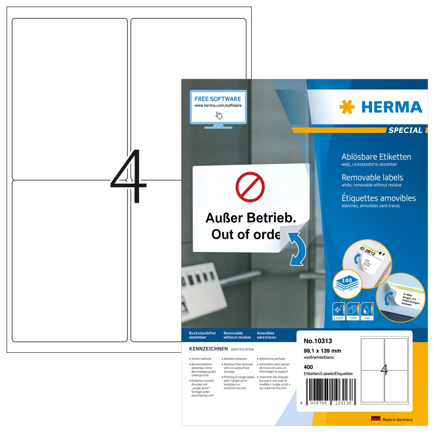 Étiquettes d'adresse amovibles, A4, 99,1 x 139 mm, blanches, opaques