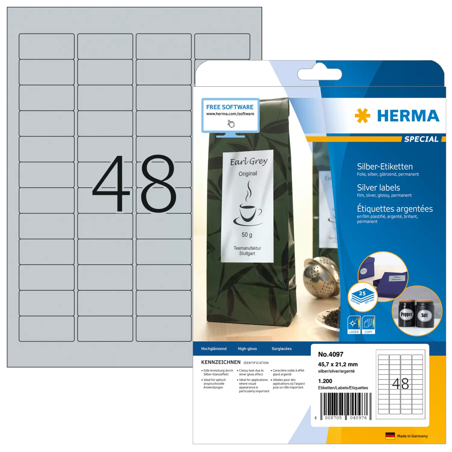 - Étiquettes argentées en film de polyester brillant, sur feuilles A4