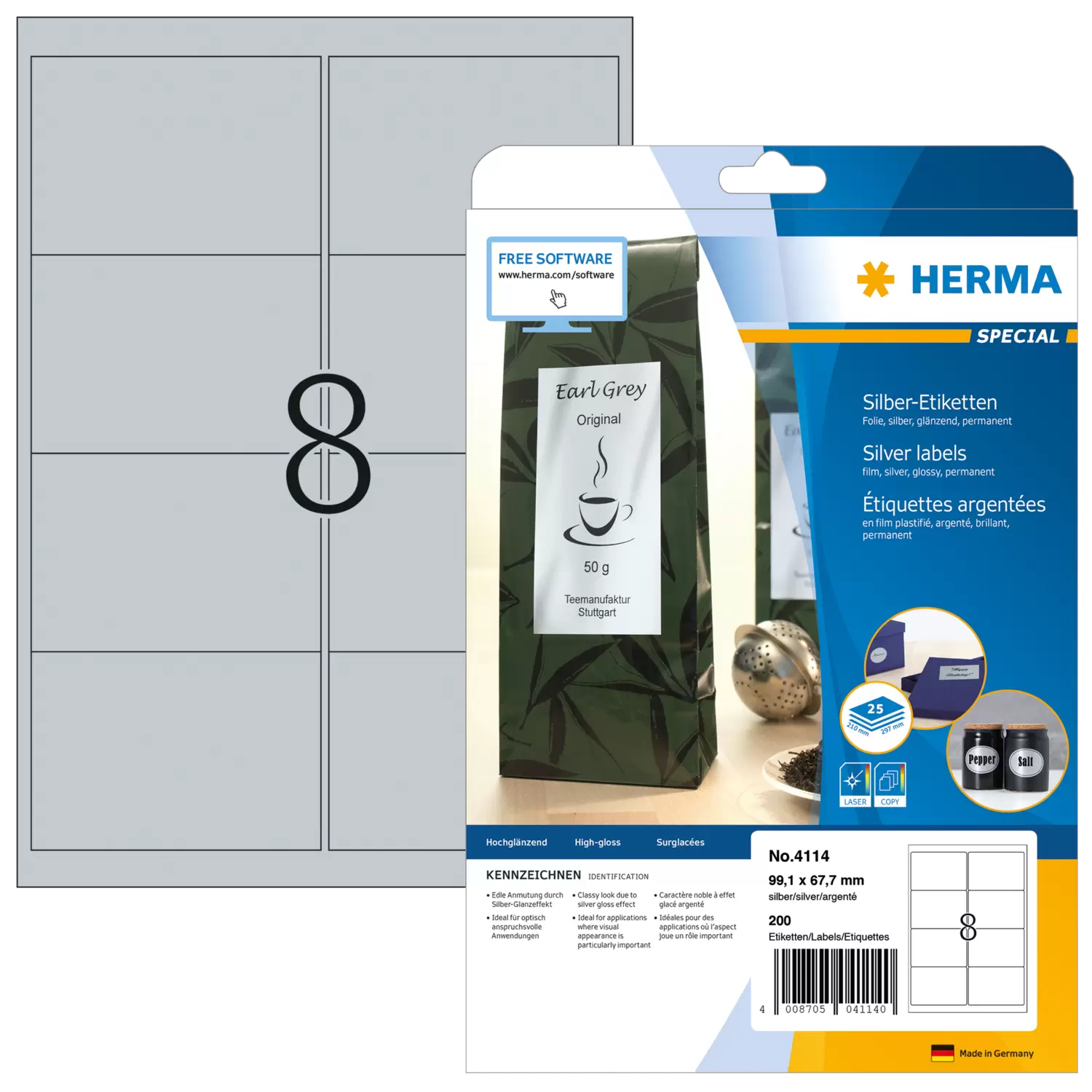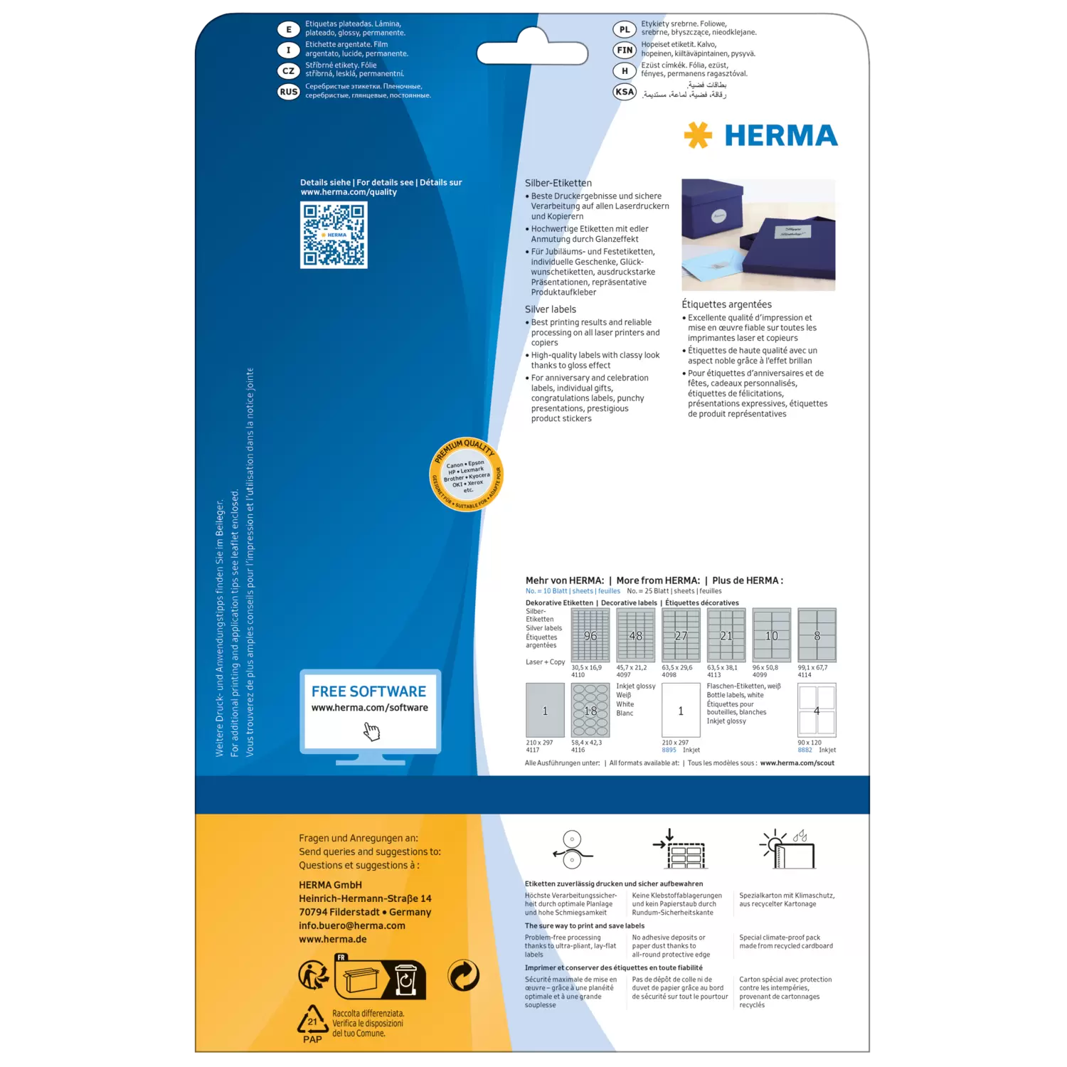 - Étiquettes argentées en film de polyester brillant, sur feuilles A4