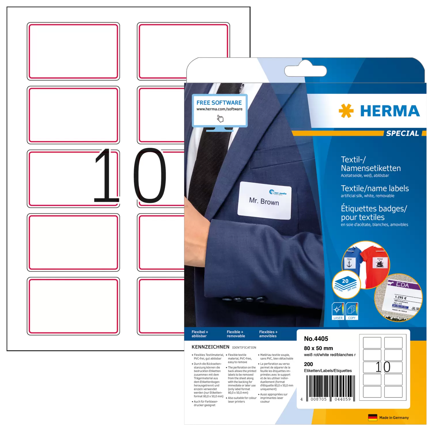 Étiquettes badges/textiles, amovibles, A4, 80,0 x 50,0 mm, blanches/cadre rouge, en soie d'acétate