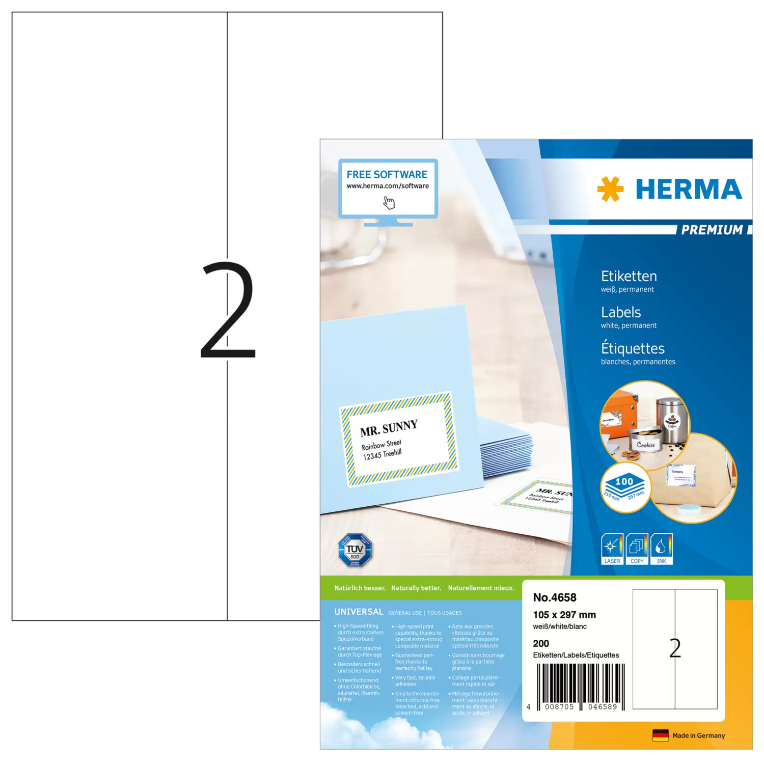 Étiquettes PREMIUM, A4, 105 x 297 mm, blanches, adhérence permanente