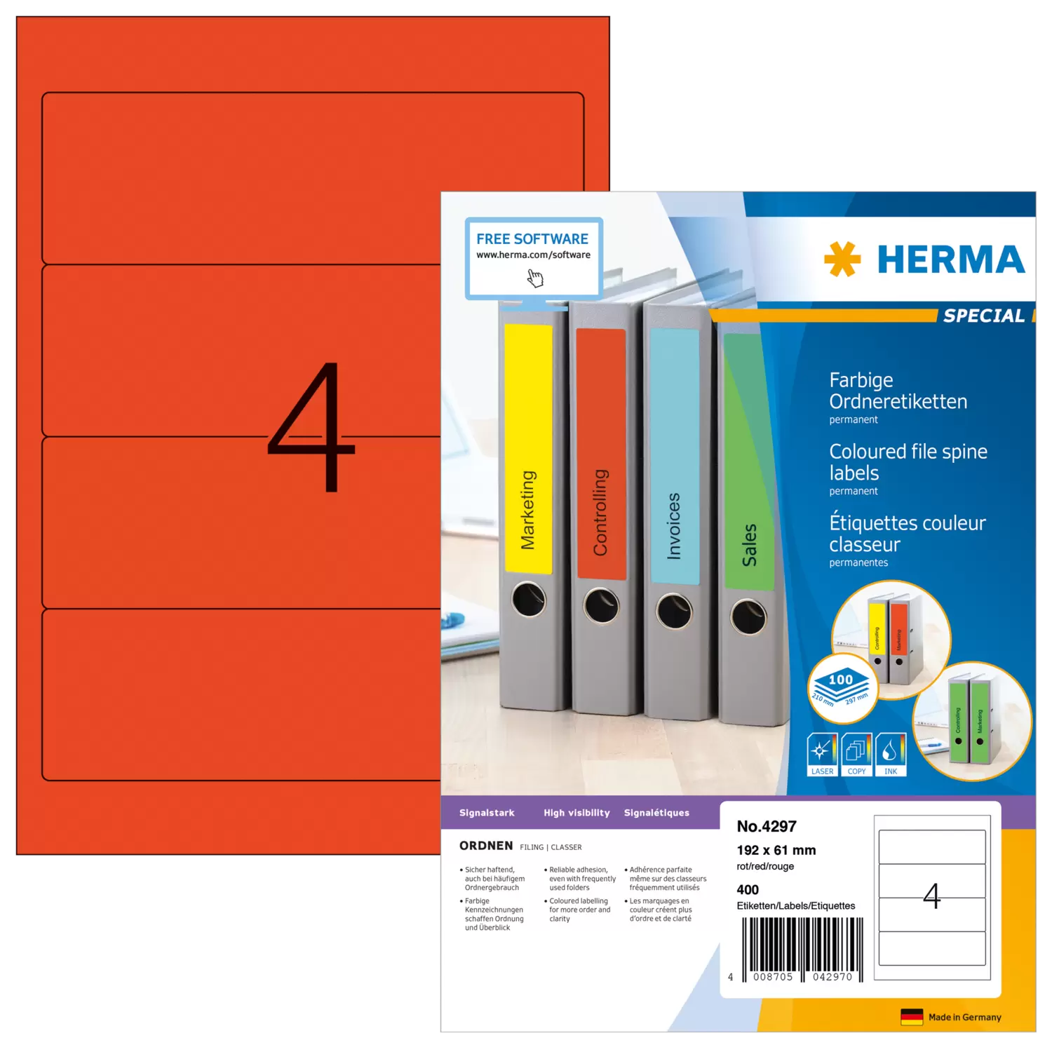 Étiquettes classeur A4, 192 x 61 mm, rouges, adhérence permanente, pour classeurs larges (c