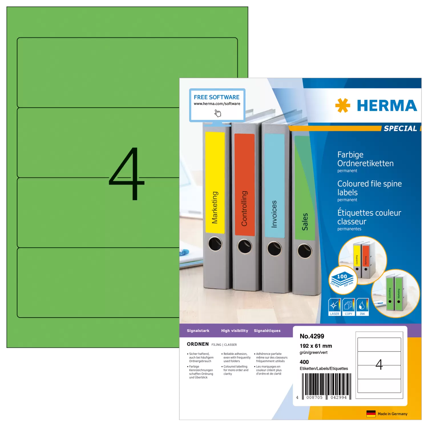Étiquettes classeur A4, 192 x 61 mm, vertes, adhérence permanente, pour classeurs larges (c