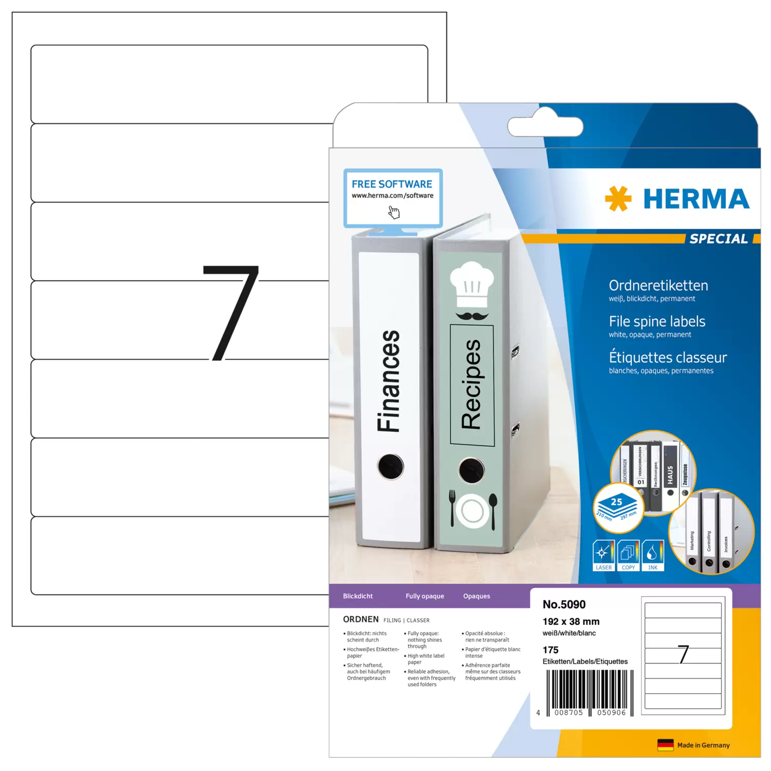 Étiquettes classeur A4, 192 x 38 mm, blanches, opaques, adhérence permanente, pour classeurs étroits