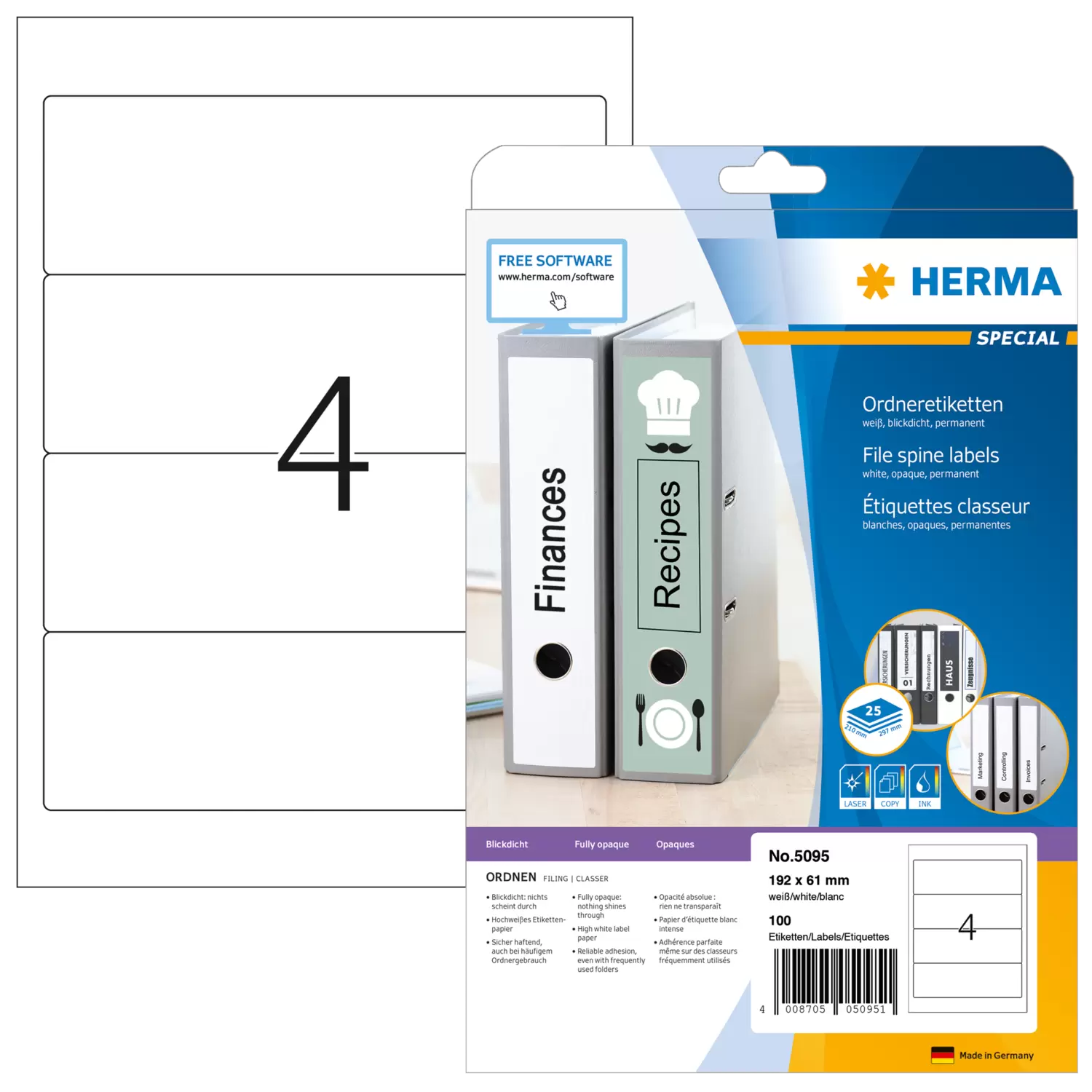 Étiquettes classeur A4, 192 x 61 mm, blanches, opaques, adhérence permanente, pour classeurs larges