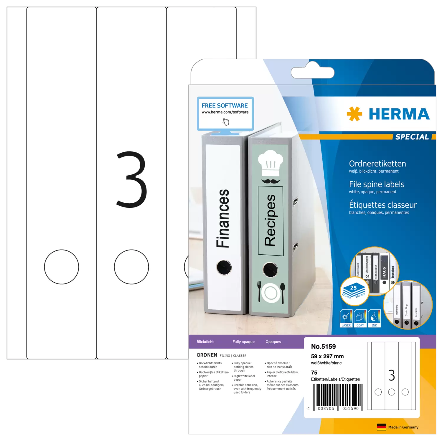 Étiquettes classeur A4, 59 x 297 mm, blanches, opaques, adhérence permanente, pour classeurs larges