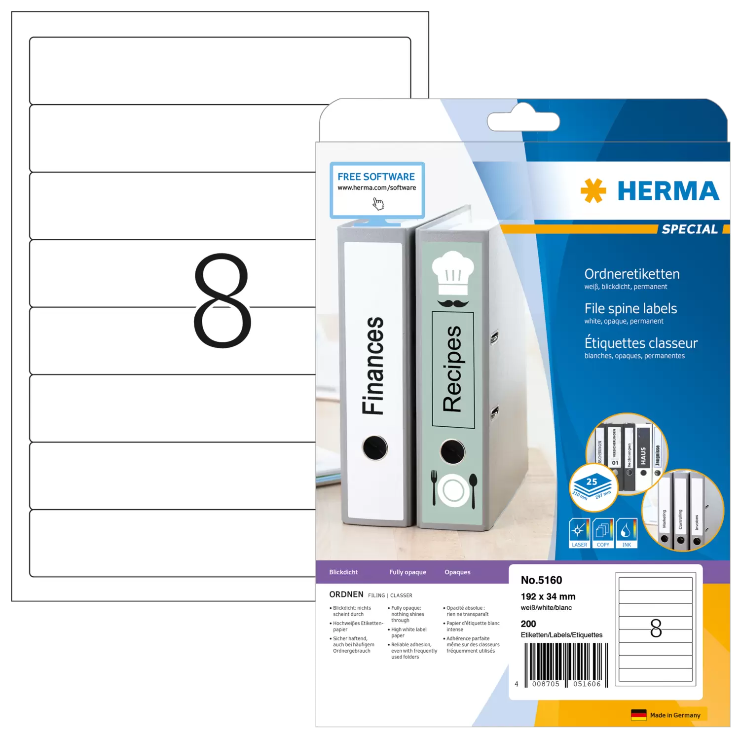 Étiquettes classeur A4, 192 x 34 mm, blanches, opaques, adhérence permanente, pour classeurs étroits