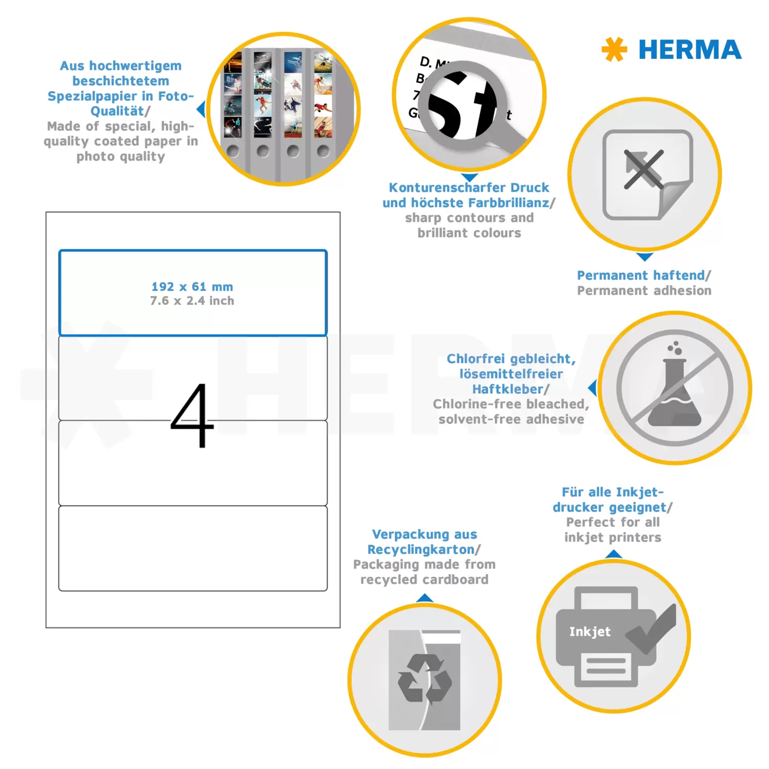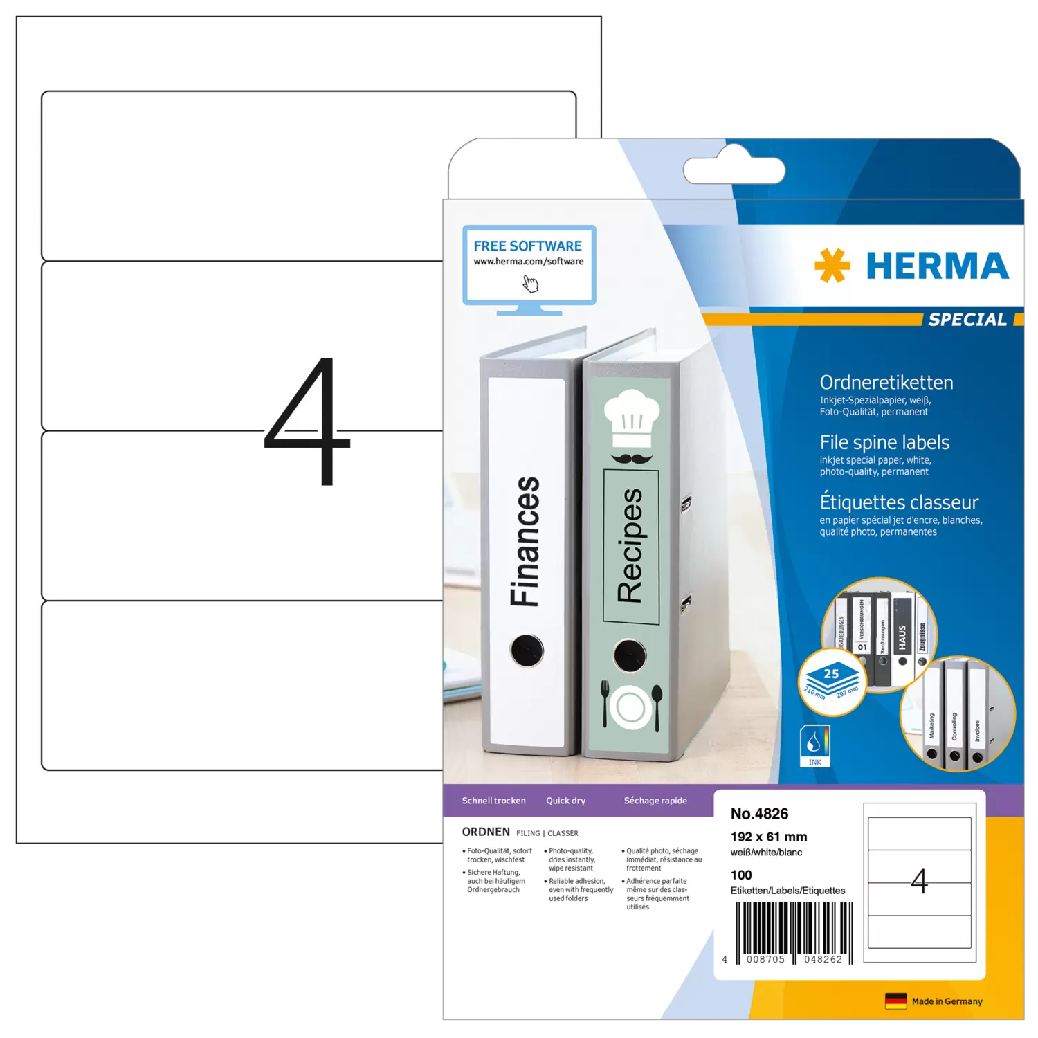 Étiquettes classeur jet d'encre, A4, 192 x 61 mm, blanches, adhérence permanente, pour classeurs lar