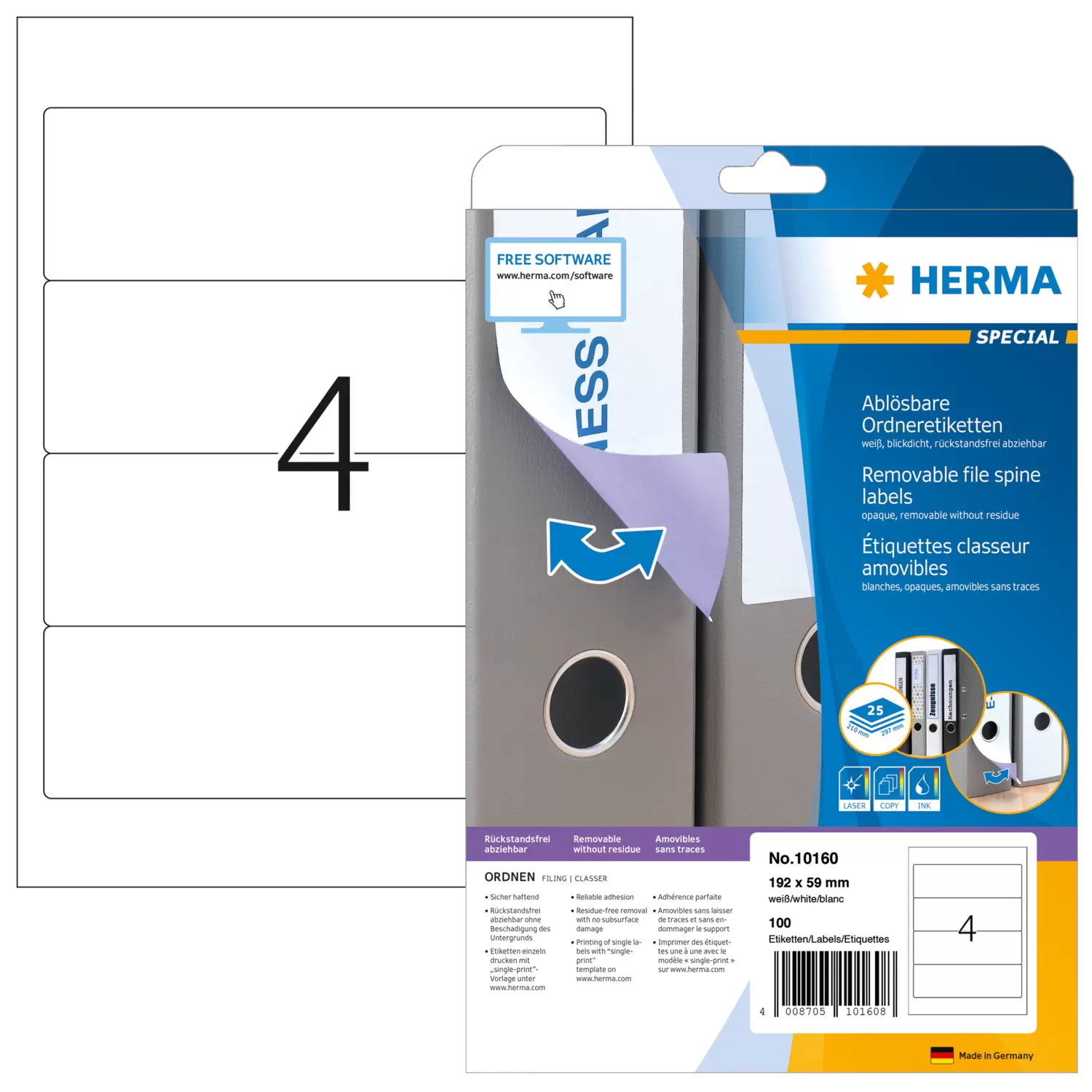 Étiquettes classeur amovibl., A4, 192 x 59 mm, blanches, opaques, pour les classeurs larges (court)