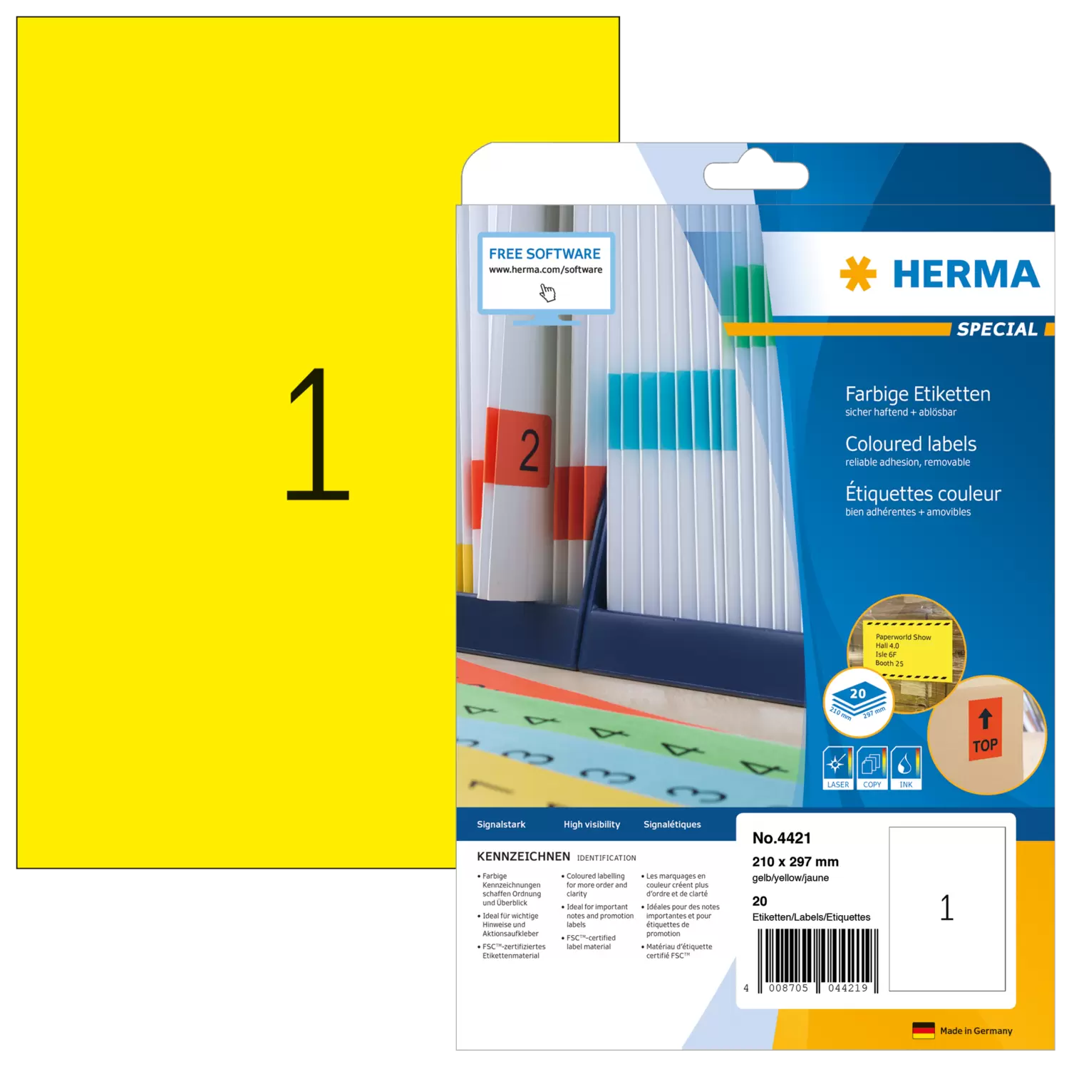 Étiquettes couleur, A4, 210 x 297 mm, jaunes, amovibles