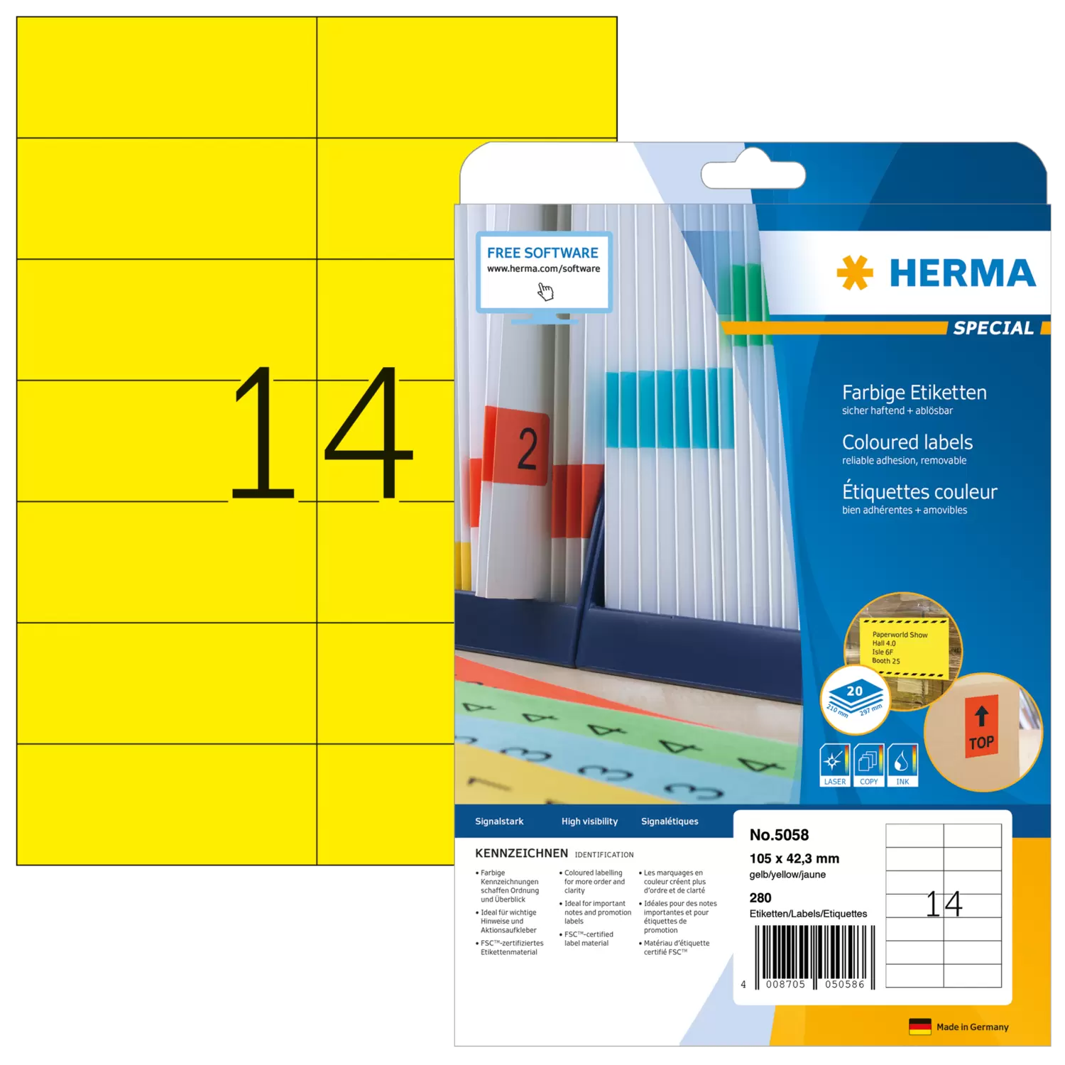 Étiquettes couleur, A4, 105 x 42,3 mm, jaunes, amovibles