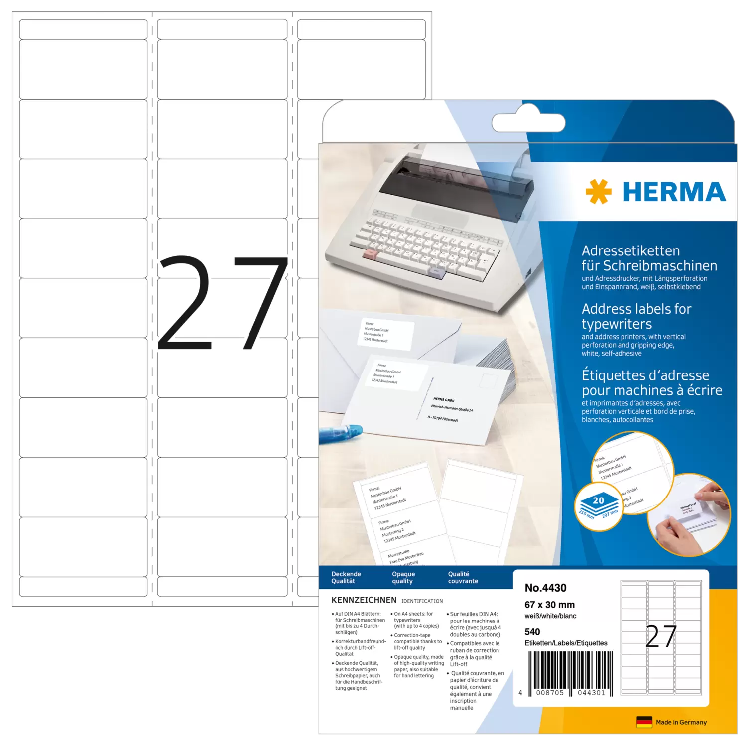 Étiquettes d'adresse pour machines à écrire, A4, 67 x 30 mm, blanches, permanentes