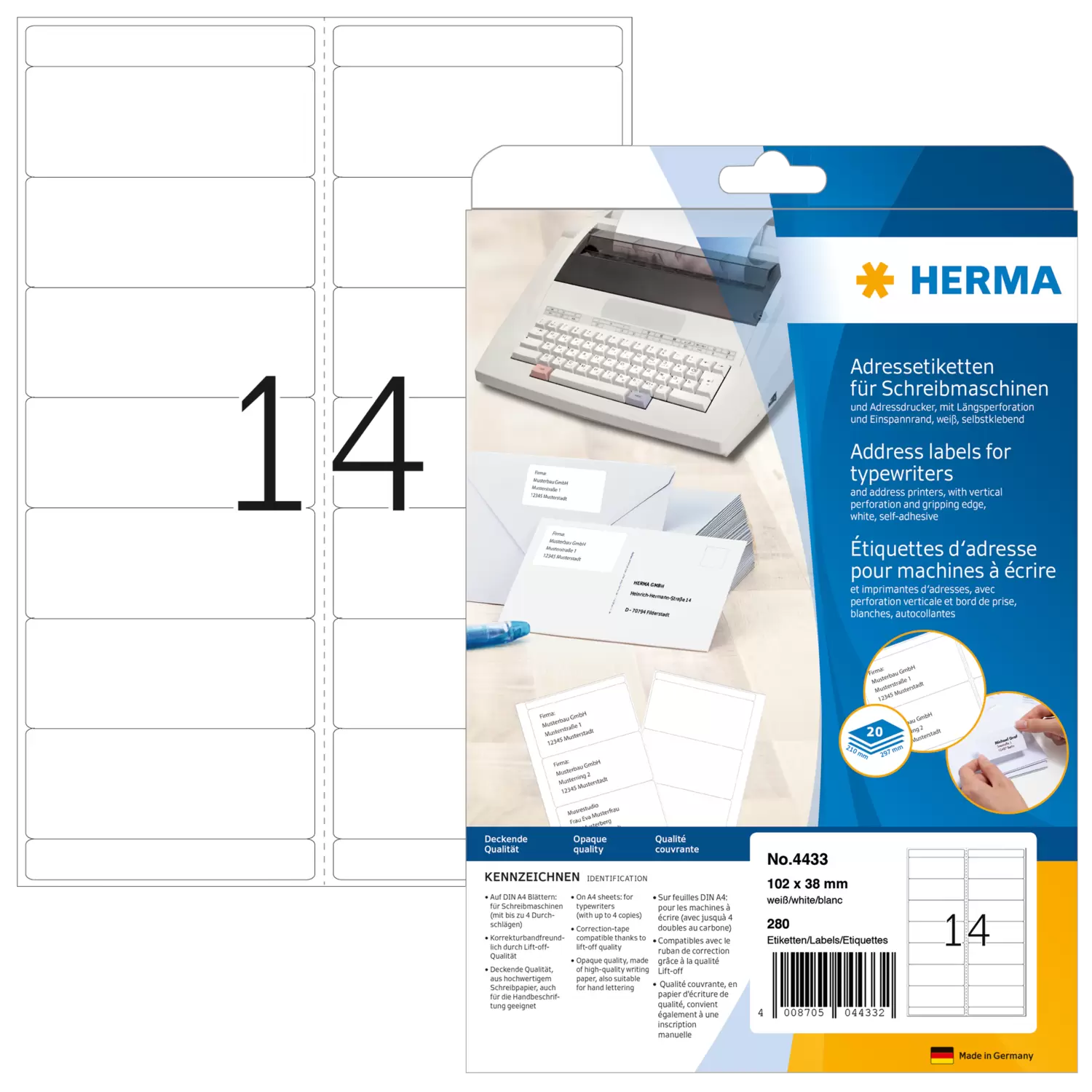 Étiquettes d'adresse pour machines à écrire, A4, 102 x 38 mm, blanches, permanentes