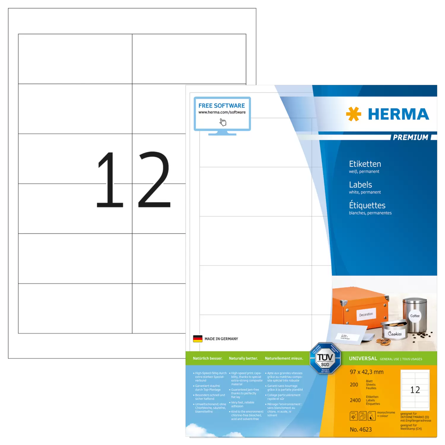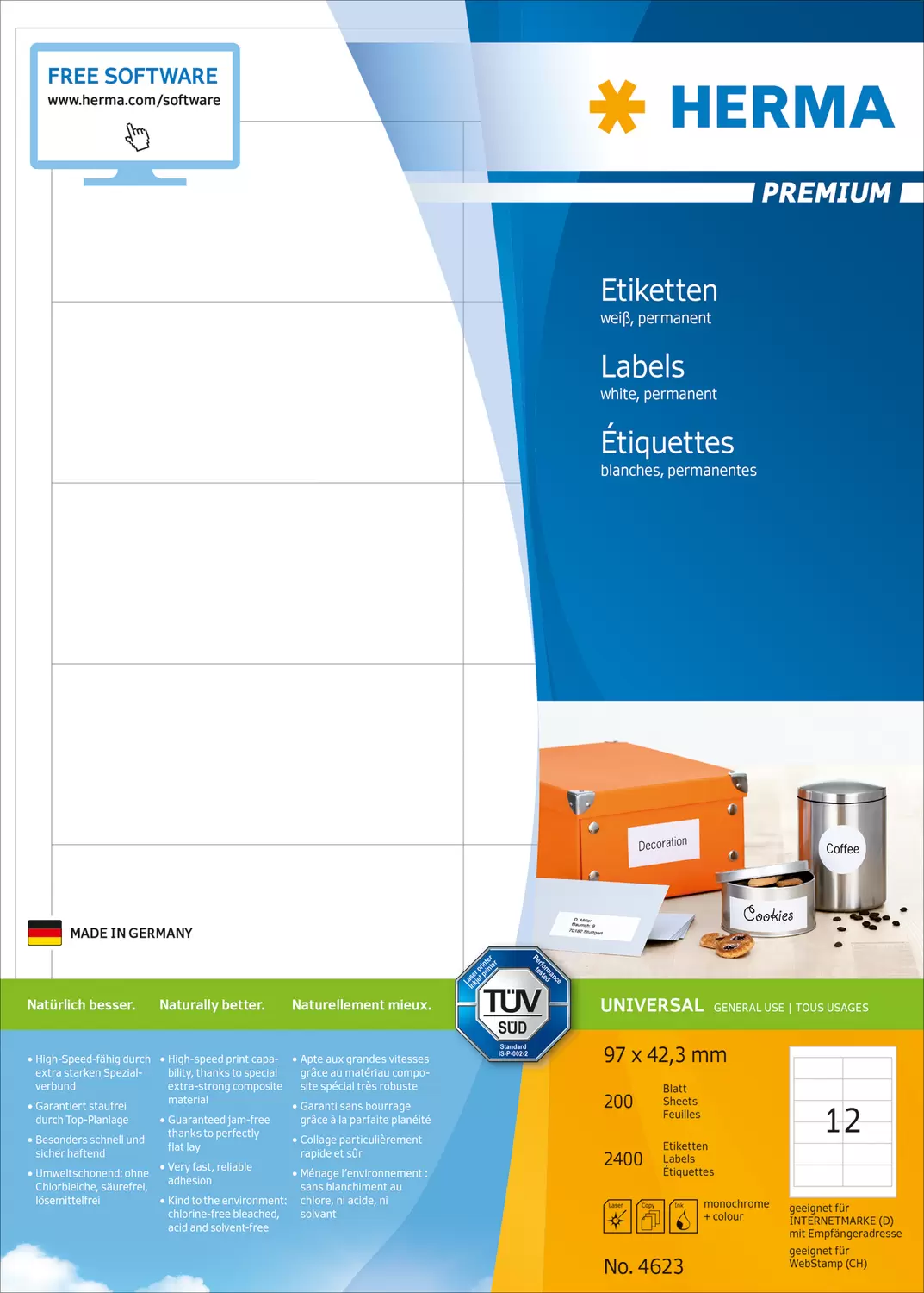 Étiquettes PREMIUM, A4, 97 x 42,3 mm, blanches, adhérence permanente