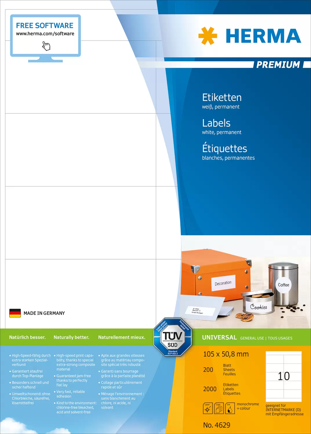 Étiquettes PREMIUM, A4, 105 x 50,8 mm, blanches, adhérence permanente