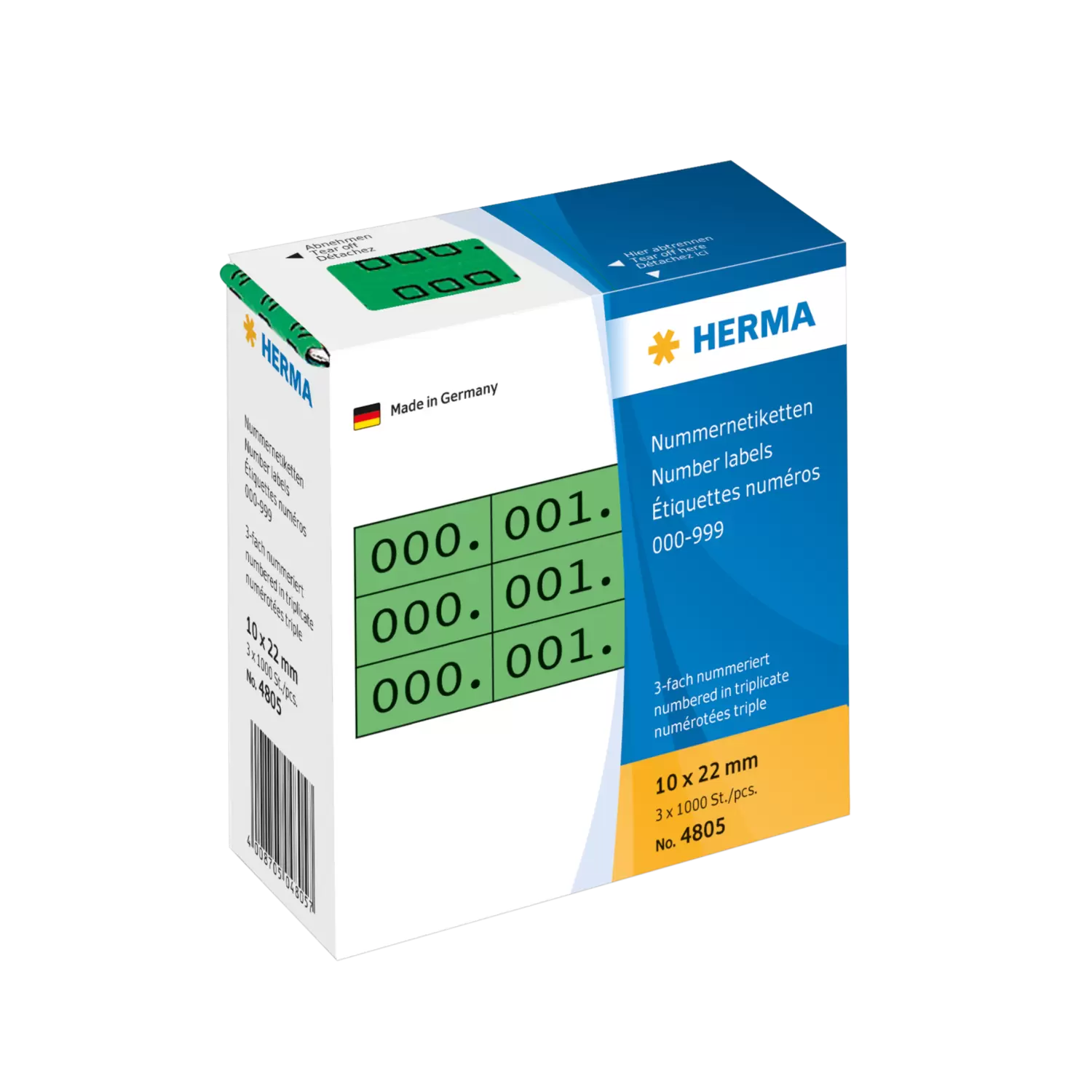 Étiquettes de numérotation autocollantes en papier. Trois étiquettes 10 x 22 mm les unes à côté des autres avec trois numéros identiques. Impression noir sur fond coloré. Numérotation continue de 0 à 999. 1000 numéros doubles en distributeur de carton.