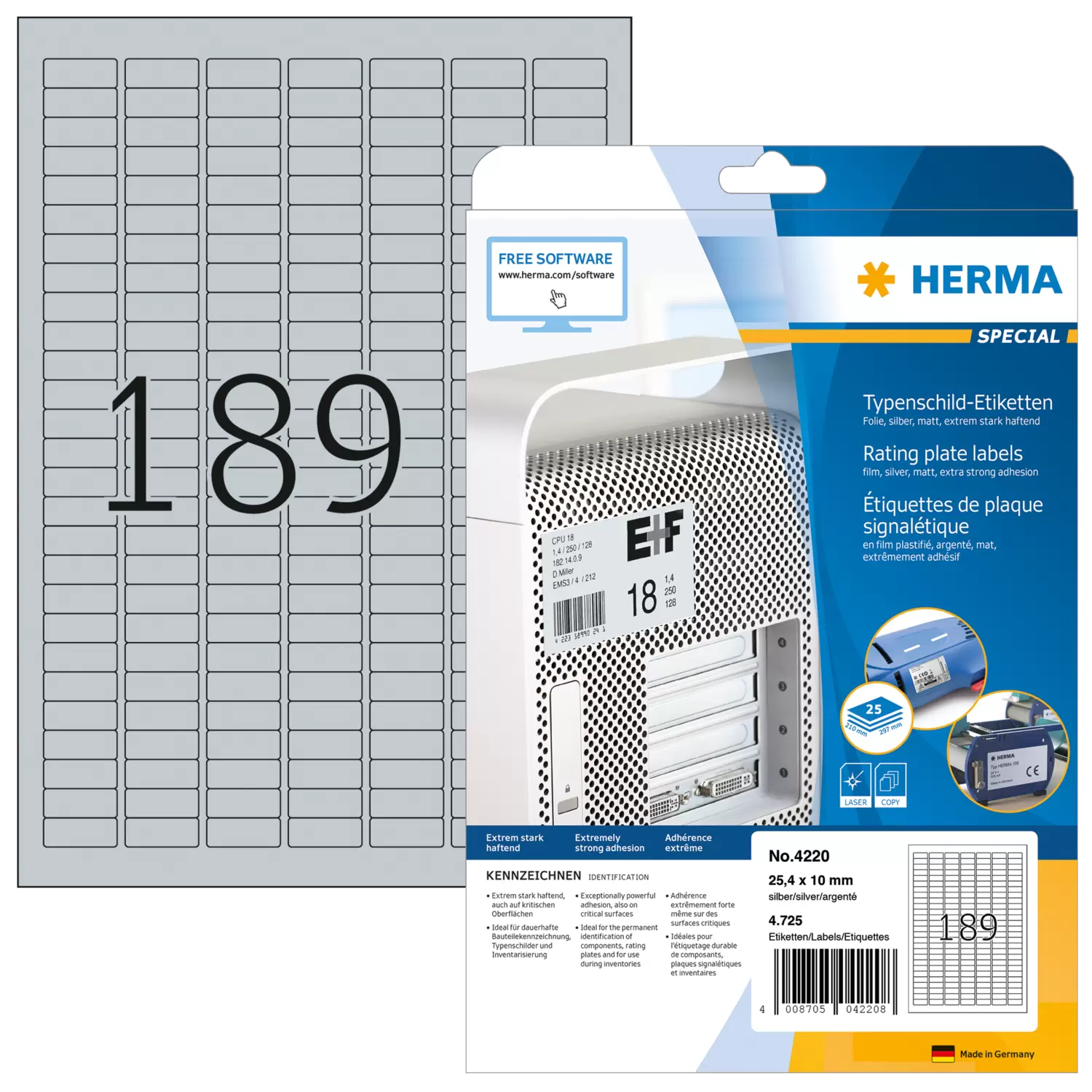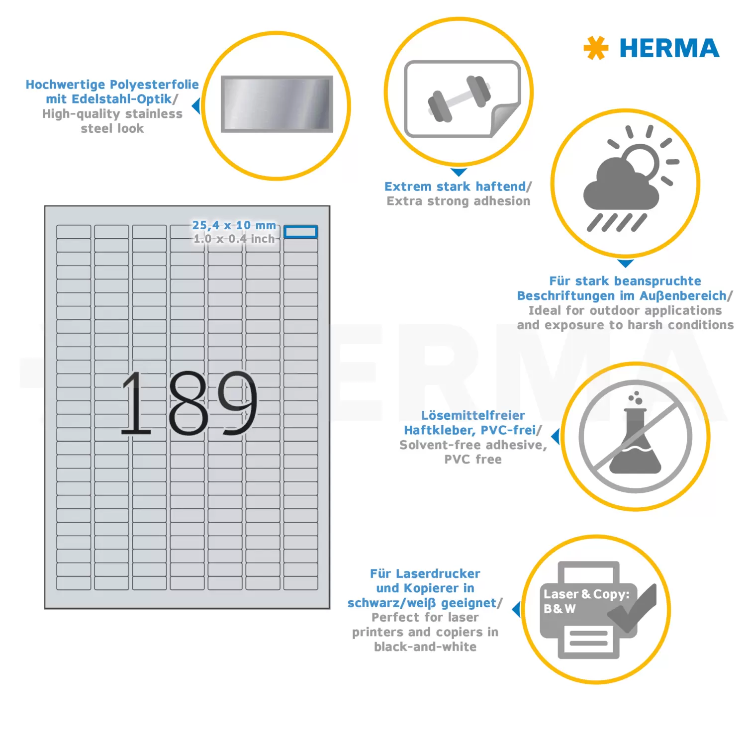 Étiq. signalétiques, argent, A4, 25,4 x 10 mm, ultra-adhérentes, résistantes aux intempéries, ind