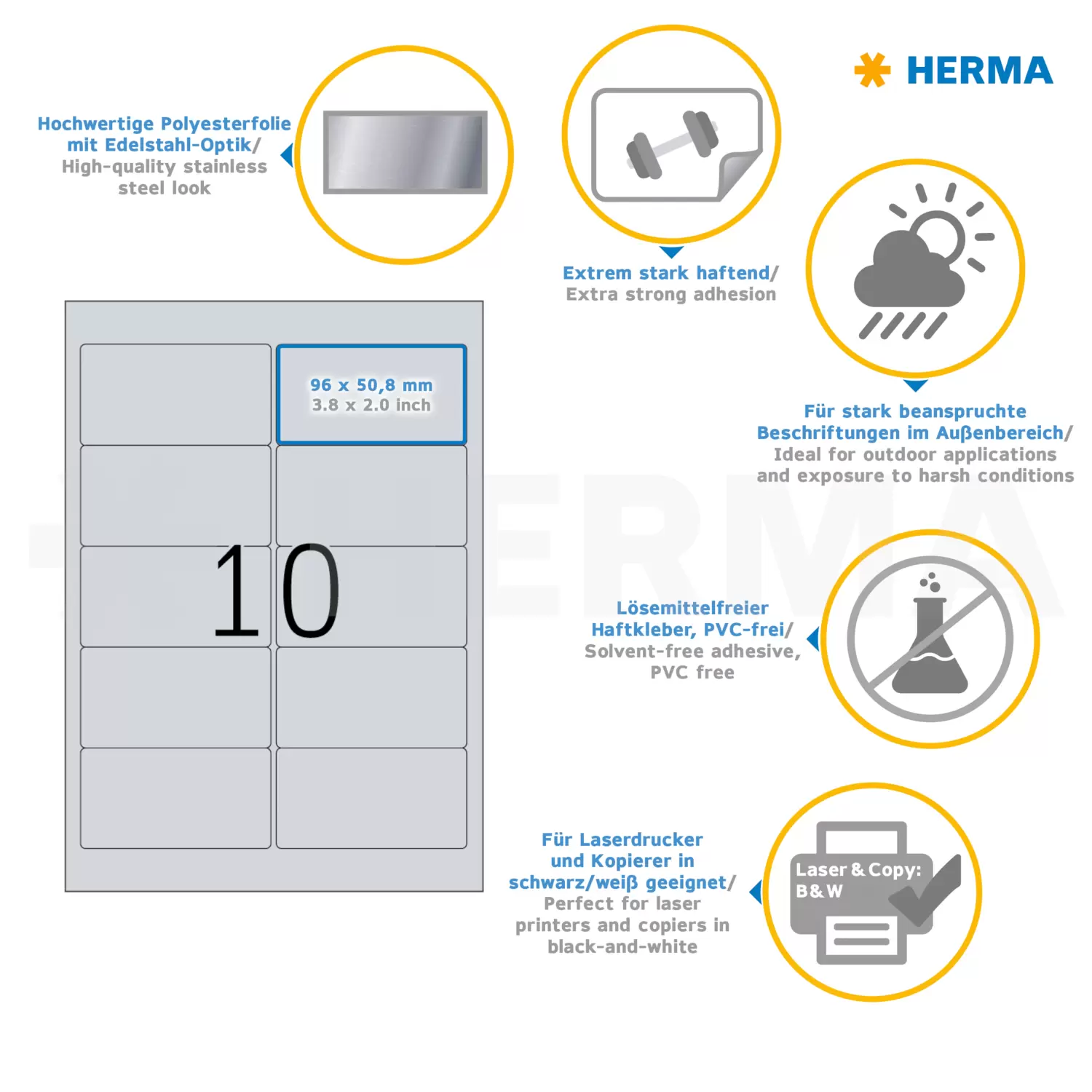 Étiquettes signalétiques, argent, A4, 96 x 50,8 mm, ultra-adhérentes, résistantes aux intempéries, i
