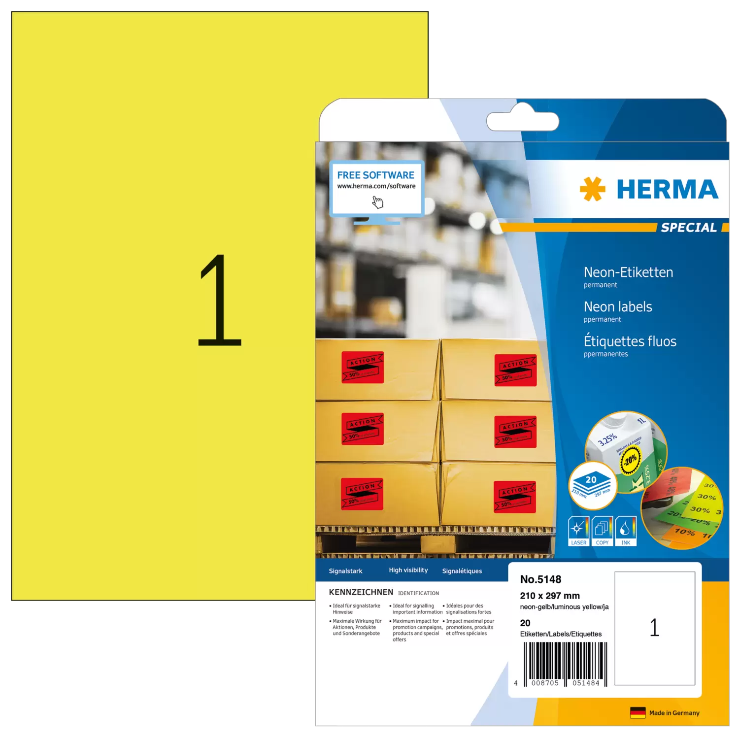 Étiquettes fluo, A4, 210 x 297 mm, jaunes fluo, adhérence permanente