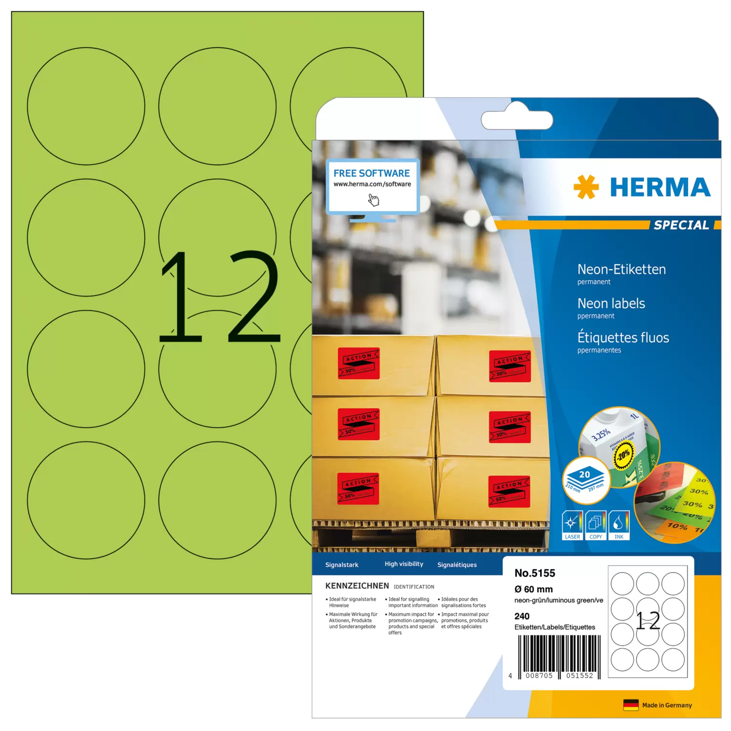 Étiquettes fluo, A4, Ø 60 mm, vertes fluo, adhérence permanente