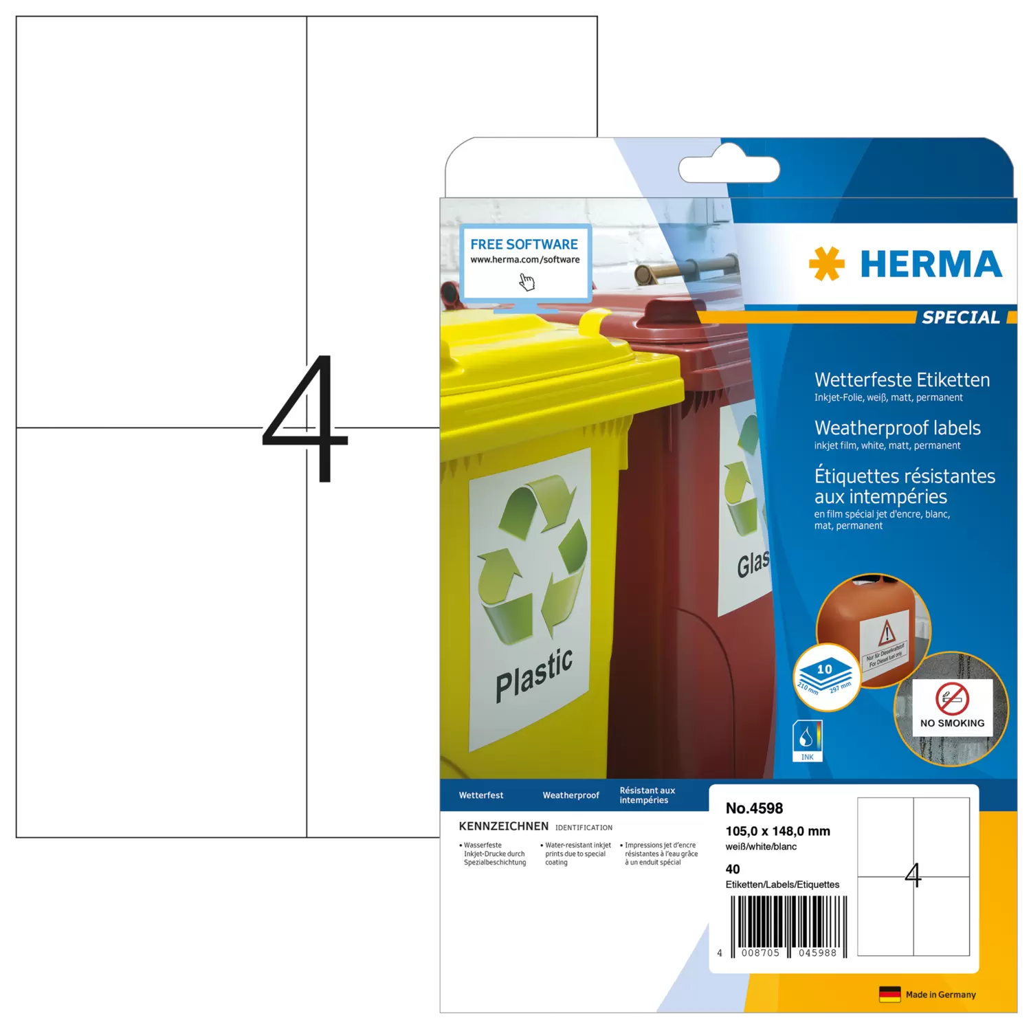 Étiquettes jet d'encre, A4, 105,0 x 148,0 mm, blanches, synthétique, résistant aux intempéries