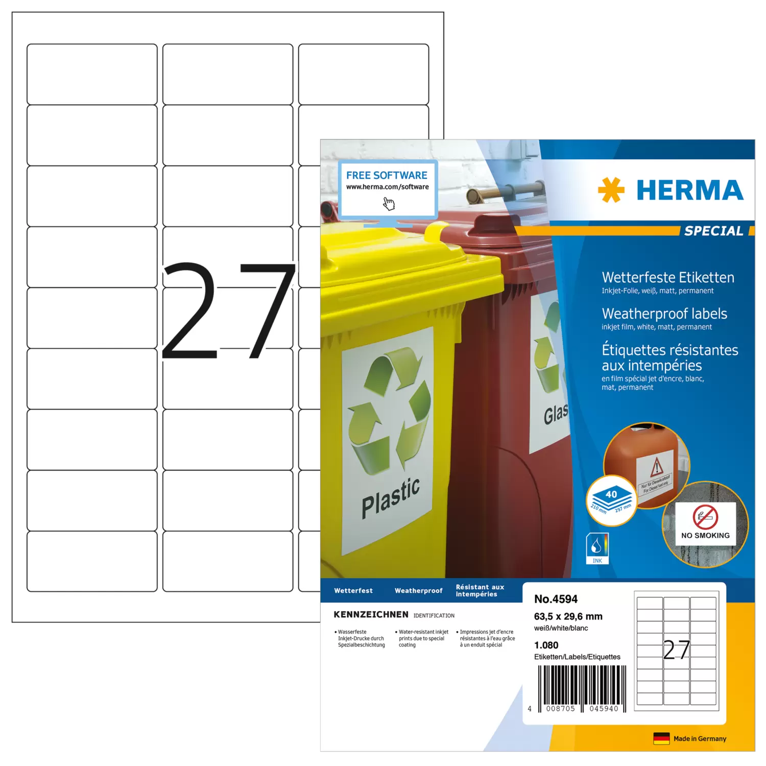 Étiquettes jet d'encre, A4, 63,5 x 29,6 mm, blanches, synthétique, résistant aux intempéries