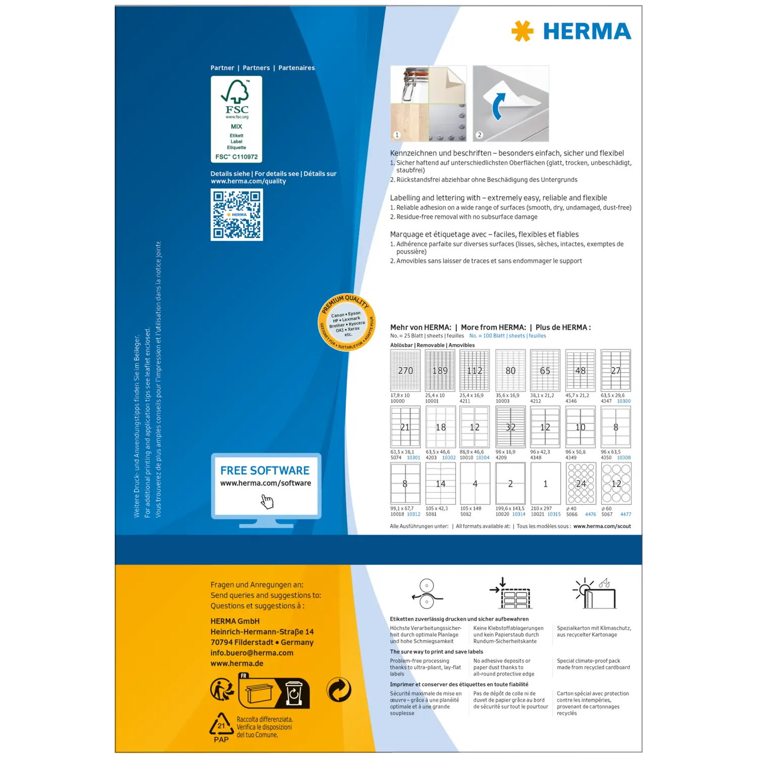 Étiquettes adhésives sur feuilles A4. Adhèrent fiablement à toutes les surfaces lisses. sèches, intactes et sans poussière. Se détachent sans laisser de traces ni endommager le support. Idéales pour des marquages limités dans le temps et des surfaces qui doivent rester intactes. Très bonnes impressions sur toutes les imprimantes laser et jet d'encre, photocopieuses, imprimantes couleur laser et photocopieuses couleur. Passage sans incident grâce aux bords de sécurité sur le pourtour et à une planéité optimale. Écologique : certifié FSC® Mix Credit, blanchi sans chlore, colle autoadhésive sans solvant. Les étiquettes sont 100 % recyclables avec les vieux papiers, emballage en carton recyclé. Outils logiciels gratuits : www.herma.com/software.