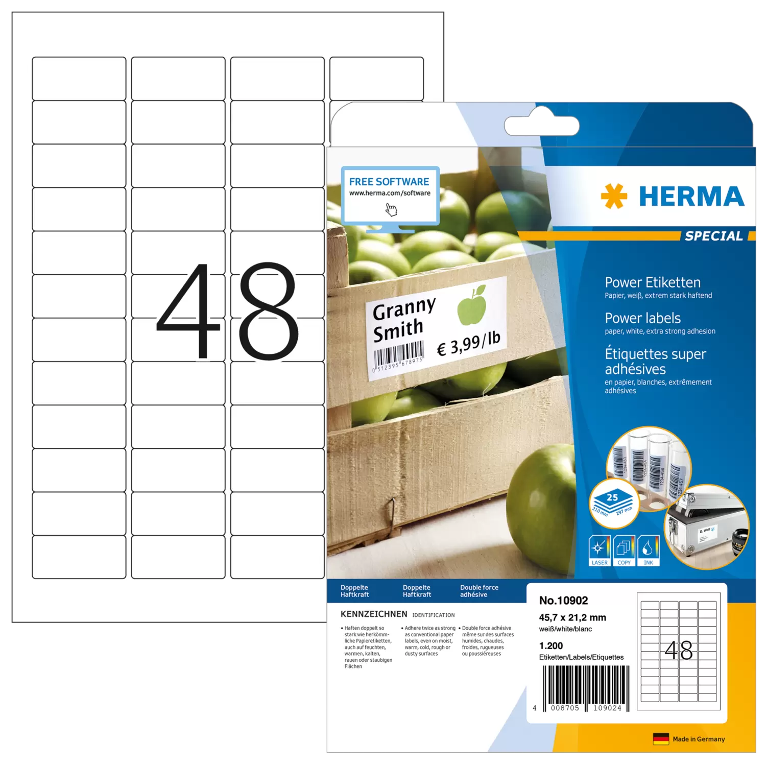 Étiquettes super adhésives, A4, 45,7 x 21,2 mm, blanches, en papier