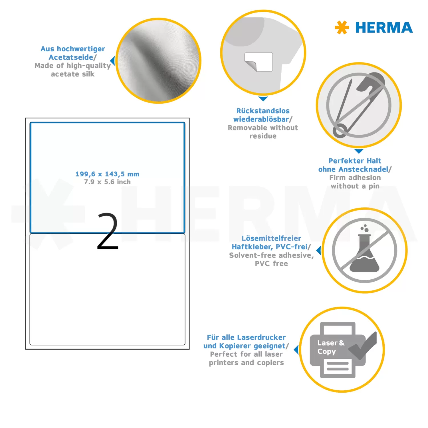 Étiquettes badges/textiles, amovibles, A4, 199,6 x 143,5 mm, blanches, en soie d'acétate