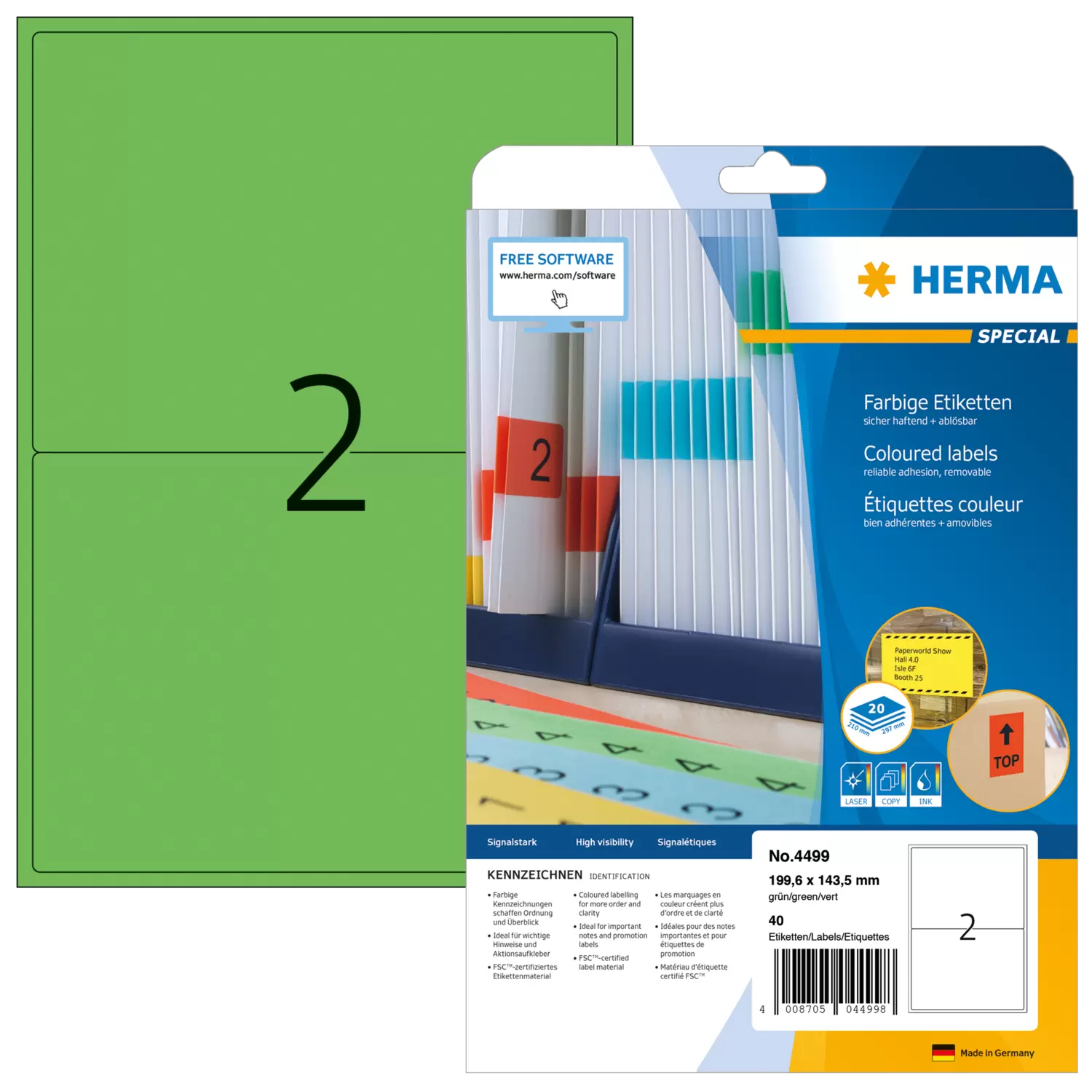 Étiquettes couleur, A4, 199,6 x 143,5 mm, vertes, amovibles