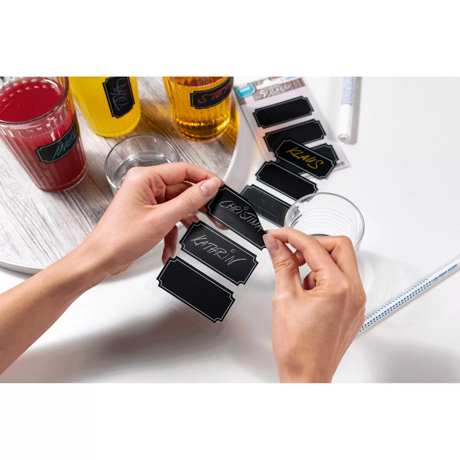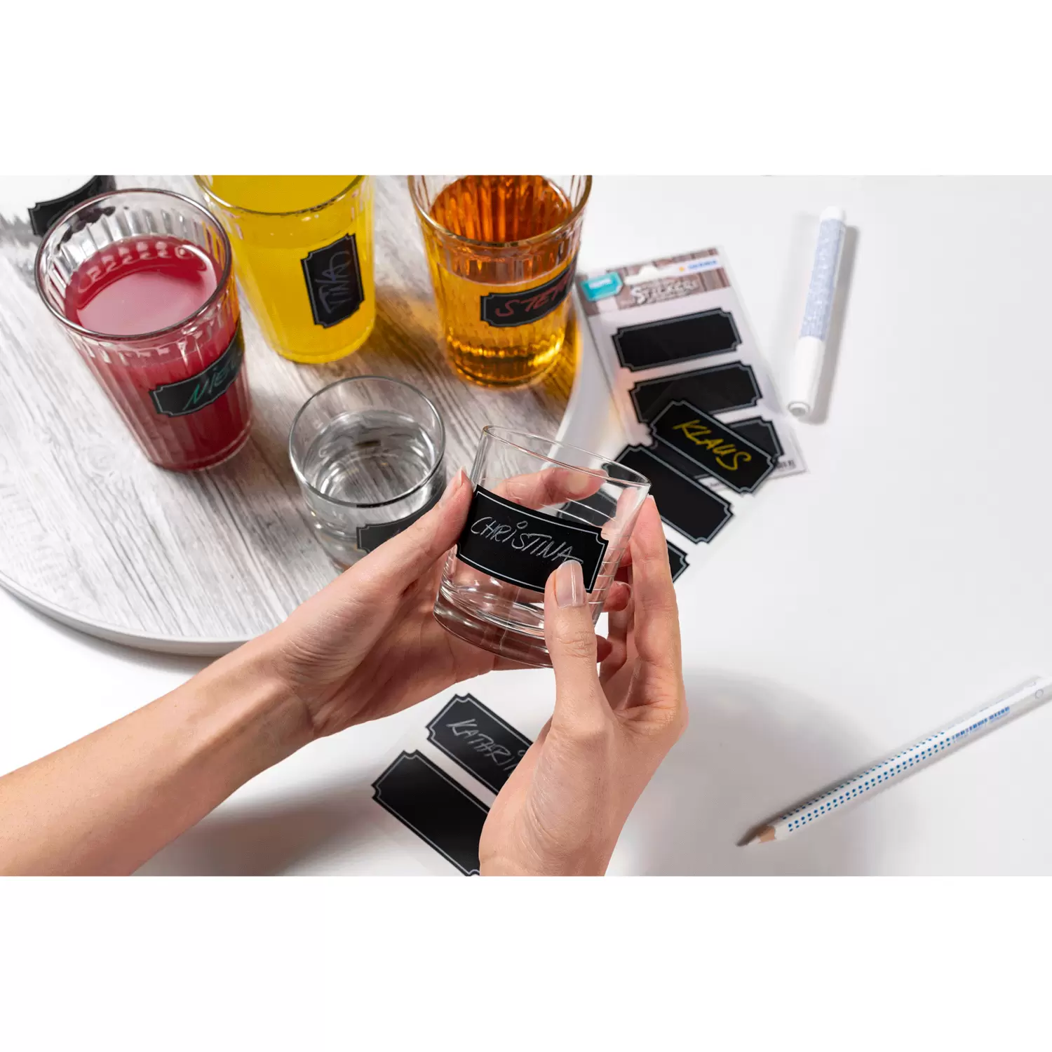 Étiquettes-ardoises: parfaites pour décorer ou offrir. Il suffit de les marquer à la craie ou au marqueur craie, puis de les appliquer. Et s’il faut corriger l’inscription, pas de problème: effacer avec un chiffon humide et écrire de nouveau. Les autocollants adhèrent en permanence sur toutes les surfaces lisses, telles que le verre, la céramique, le plastique ou le métal.