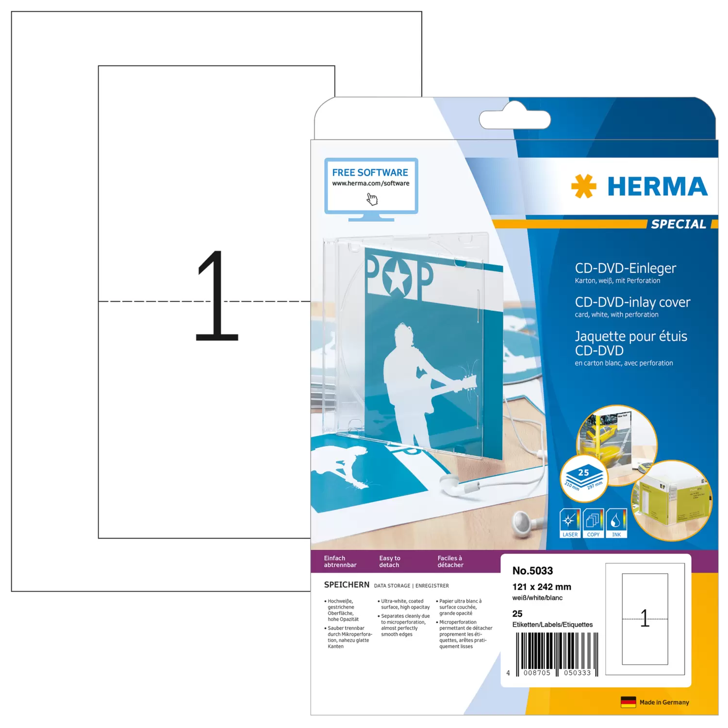 Jaquettes pour étuis CD -slimbox- A4, 121 x 242 mm, blanches, carton, perforées, non-adhésives
