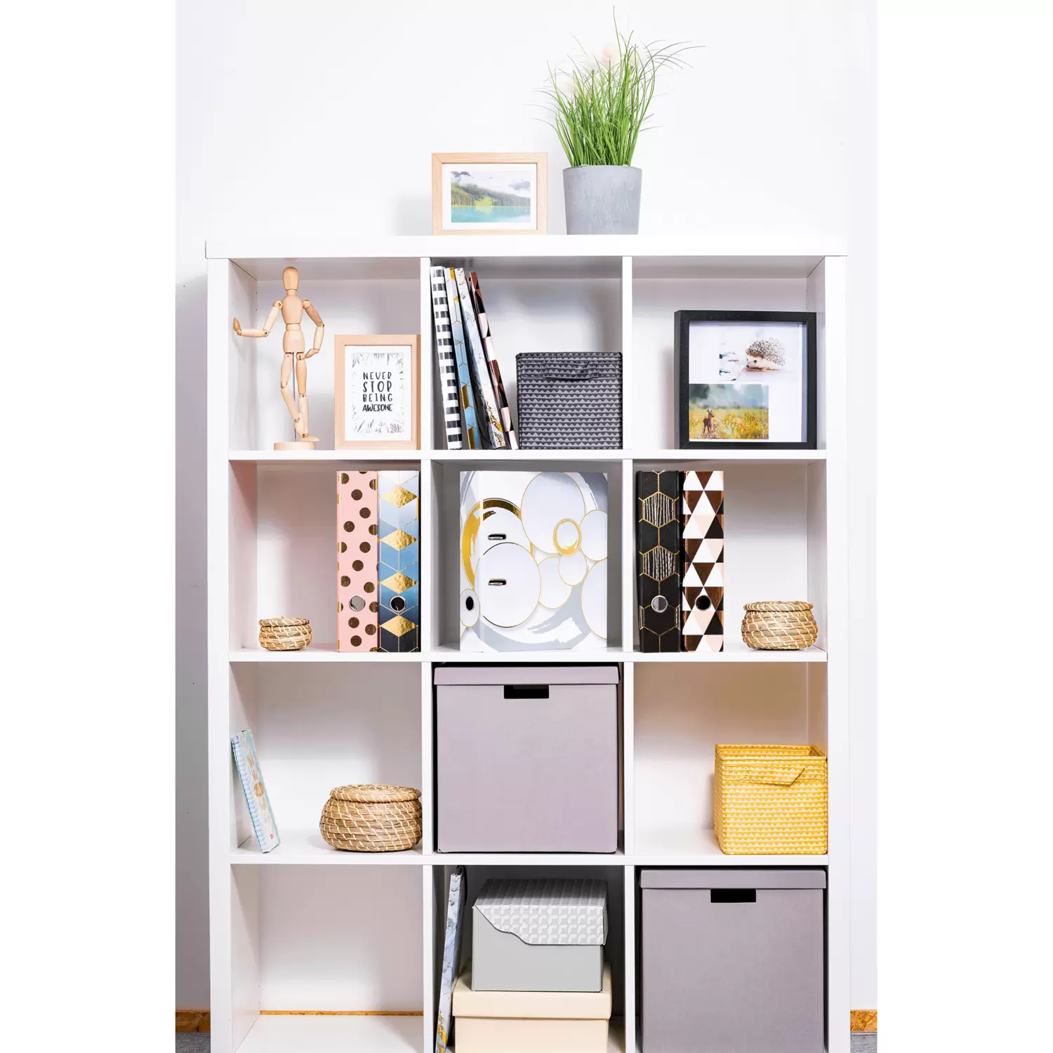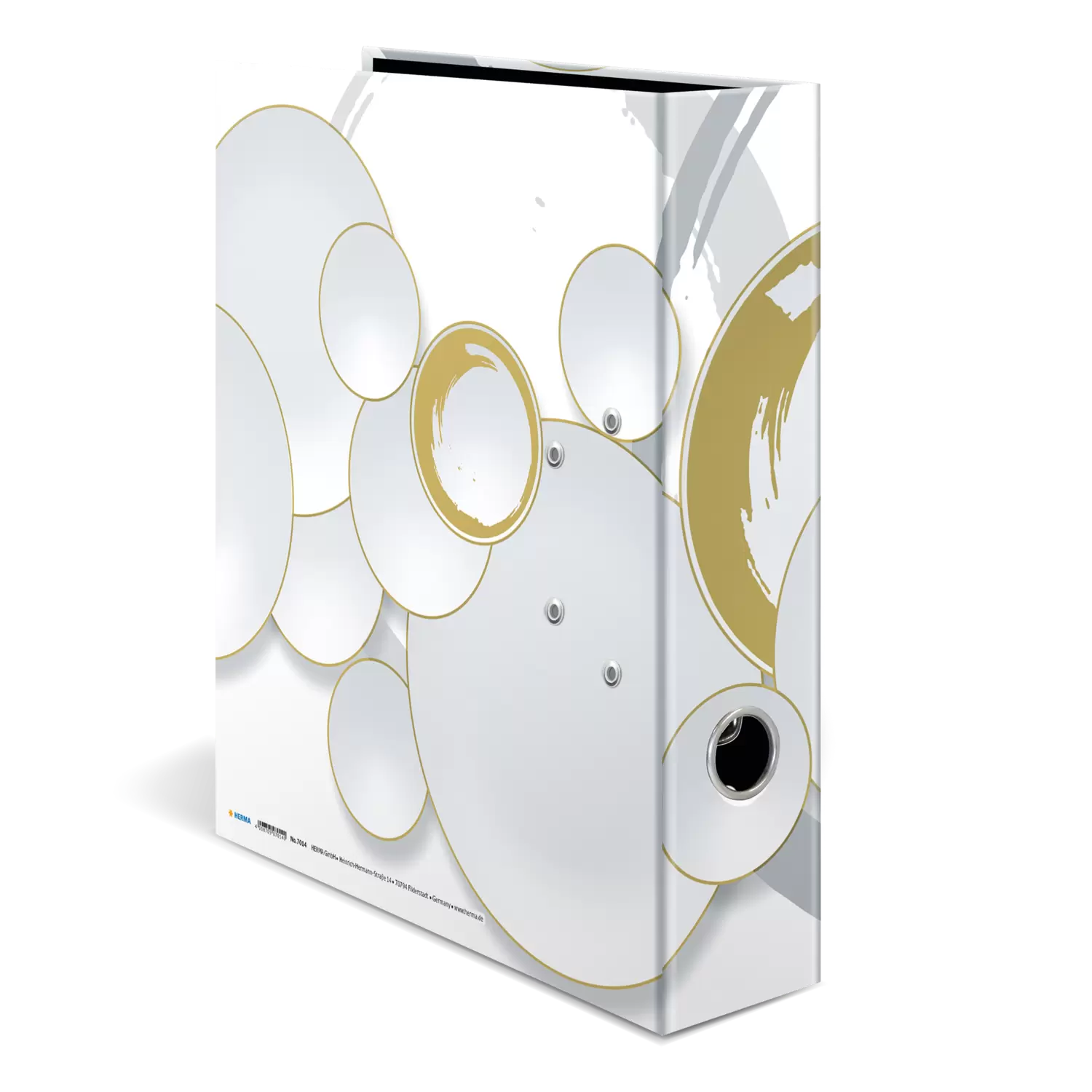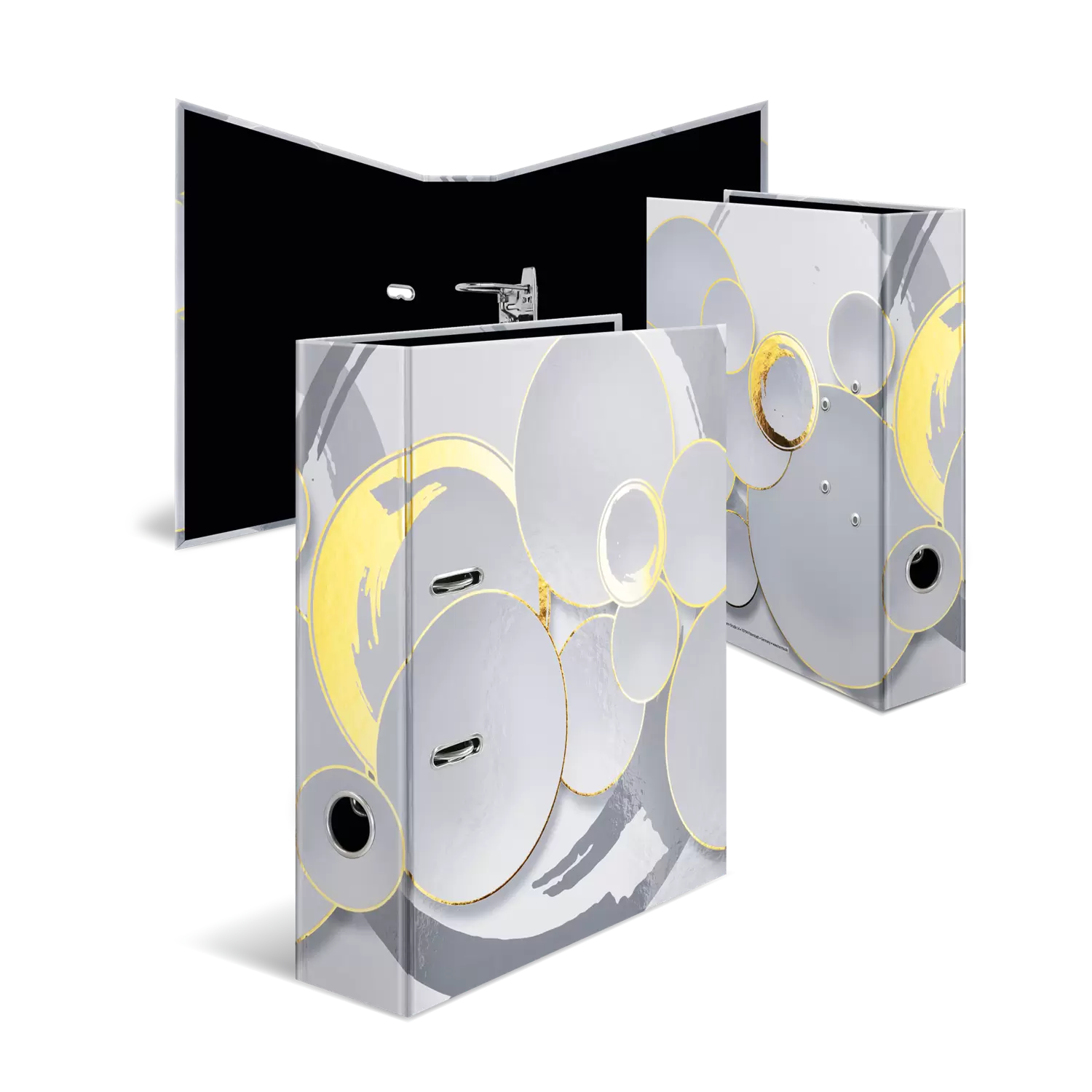 Le classeur à motifs Circles est unique en son genre. Il allie à la perfection design et fonctionnalité. Le design est sobre dans des teintes blanches et grises. Des cercles fins s’entrecroisent dans un coloris doré brillant et sont entourés de formes rondes. Un véritable plaisir pour les yeux ! Le classeur est fabriqué en carton de qualité, avec finition pelliculée dorée. Grâce au trou de préhension très pratique, il est facile à saisir et à remettre en place. Le mécanisme à levier spécial, avec dispositif de retenue en métal assure le bon maintien du contenu du classeur. Le dos large garantit une bonne stabilité sur l’étagère et offre suffisamment de place pour ranger un grand nombre de documents au format max. DIN A4.