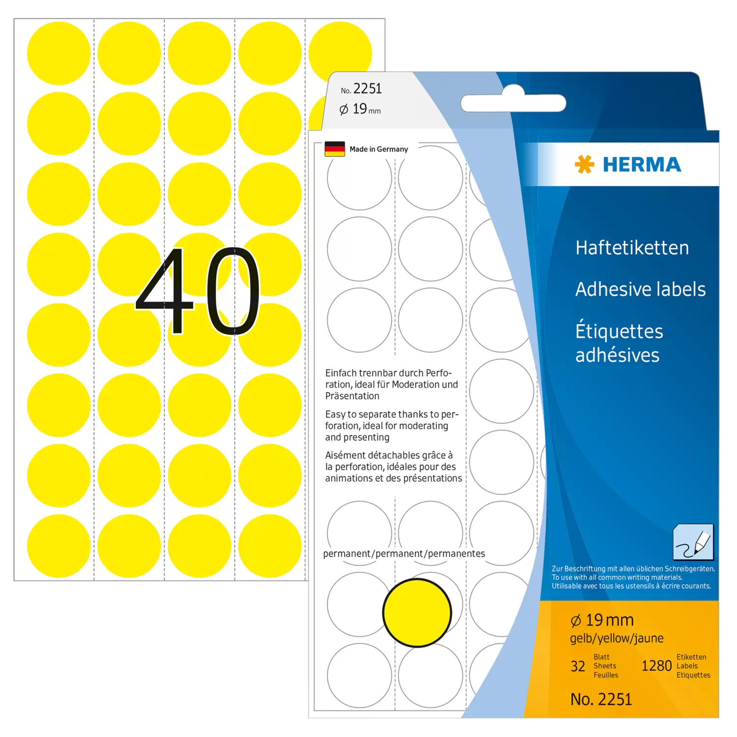 Étiquettes/pastilles de couleur Ø 19 mm, rondes, jaunes, permanentes, inscription manuelle